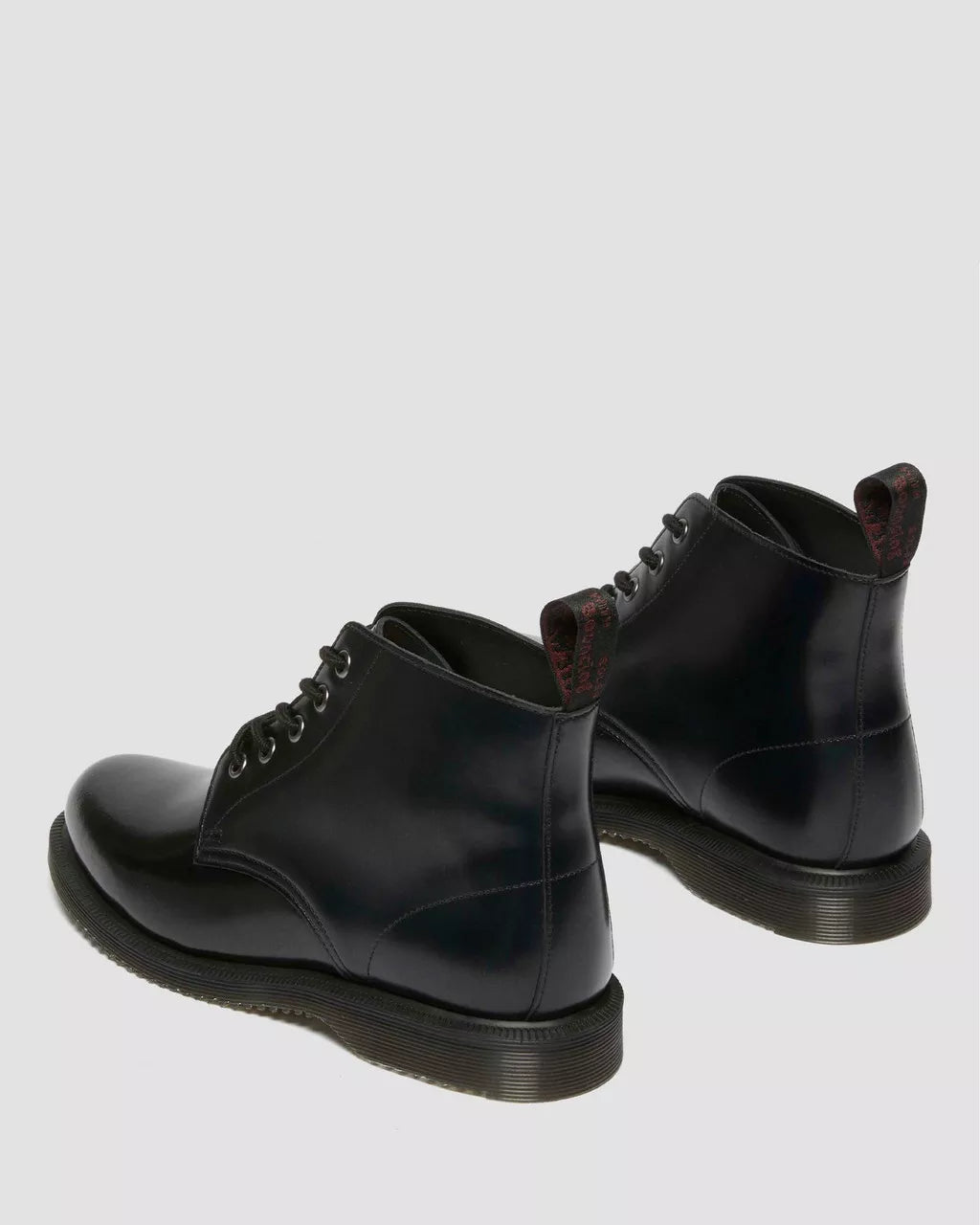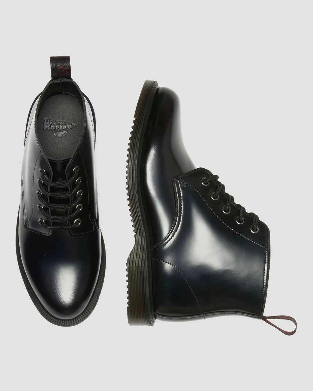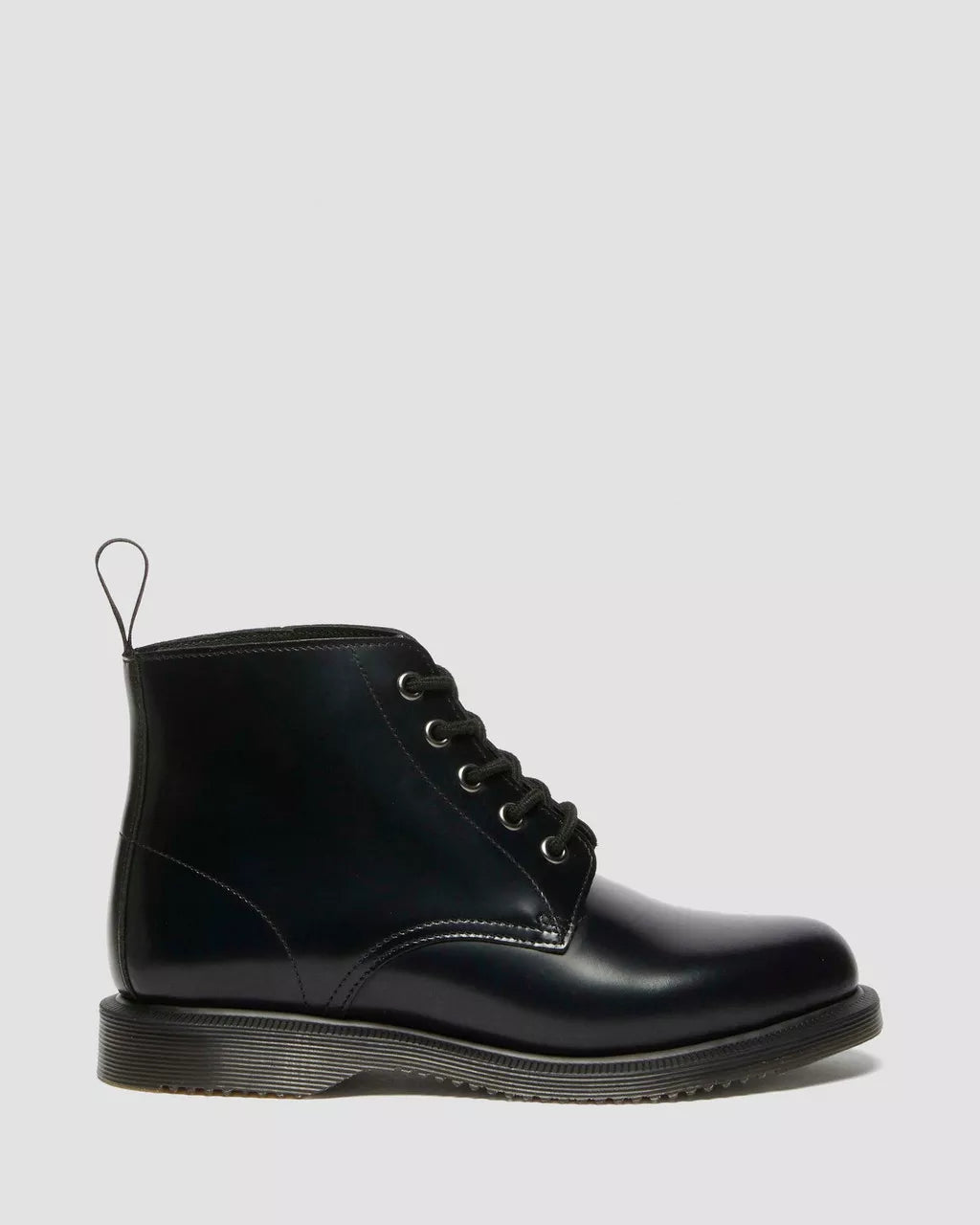 The Emmeline is a sleek 5-eye boot with a tapered toe shape. It is built from black Polished Smooth leather and punched with silver eyelets. It stands on a low-profile grooved sole secured with a plain welt for a sleek, minimalist finish. The top of the boot is tagged with a black heel loop signed in a subtle red script. Polished Smooth is the original Dr. Martens leather: super durable, with a smooth finish polished to a high shine. Clean with a damp cloth and care with Dr. Martens Shoe PolishOur Goodyear-welted lines are heat-sealed and reinforced with our signature welt stitch.