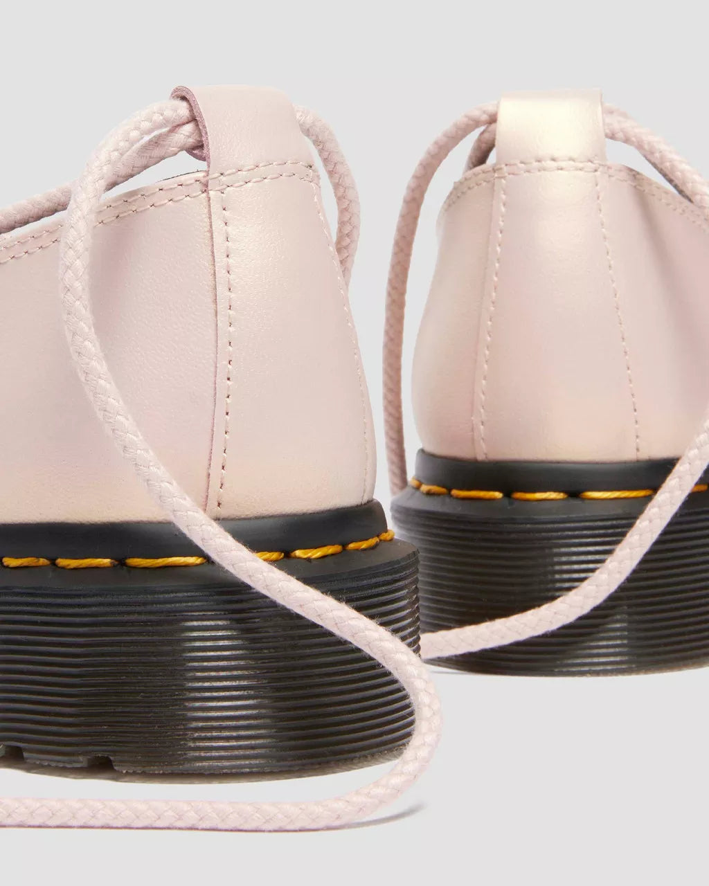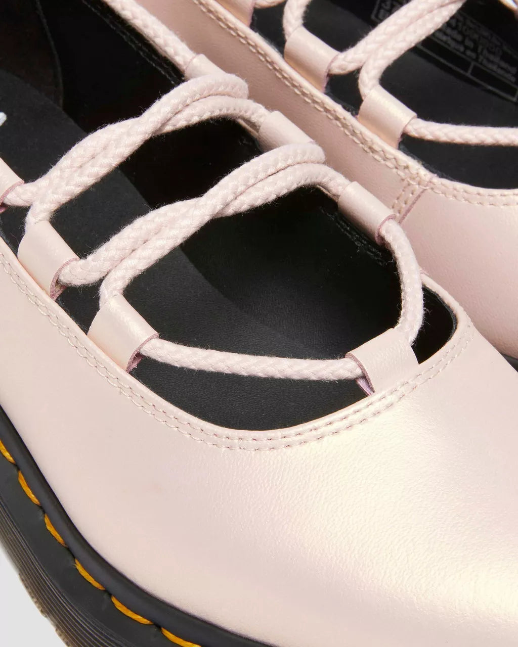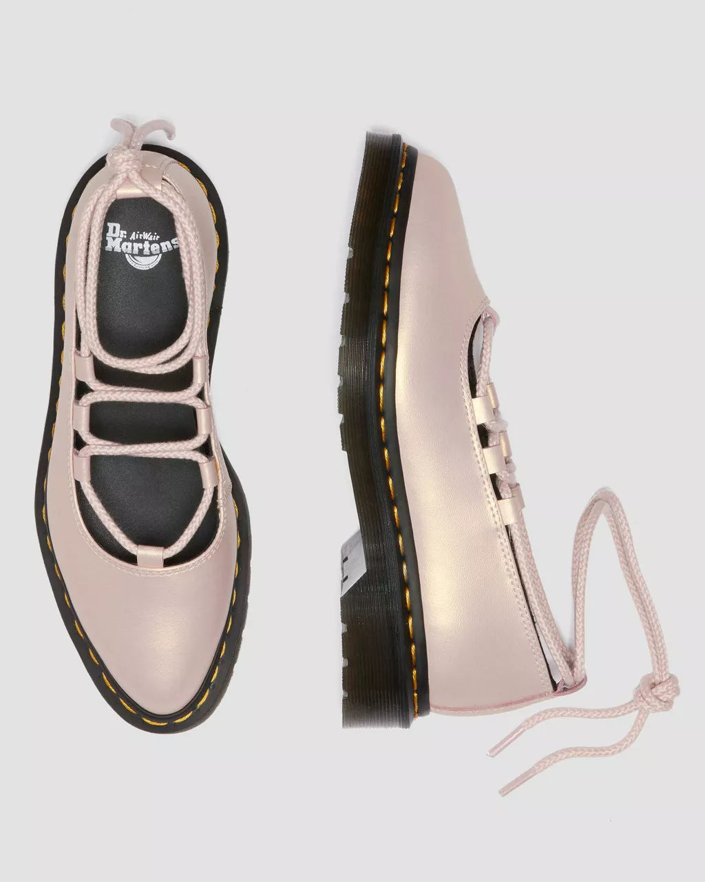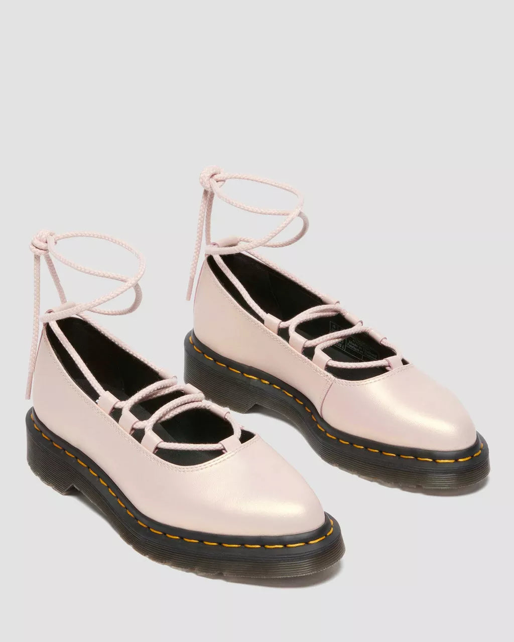 Get to the point. The Elphie ballet flat is our twist on a classic. Less dainty. More Docs. A pointed ballet flat shoe made from powder pink Shift leather with an iridescent finish. Fitted with wraparound laces, easily swapped out for a customised look. The tapered sole is marked with DM's signature grooving pattern and secured with yellow welt stitching.