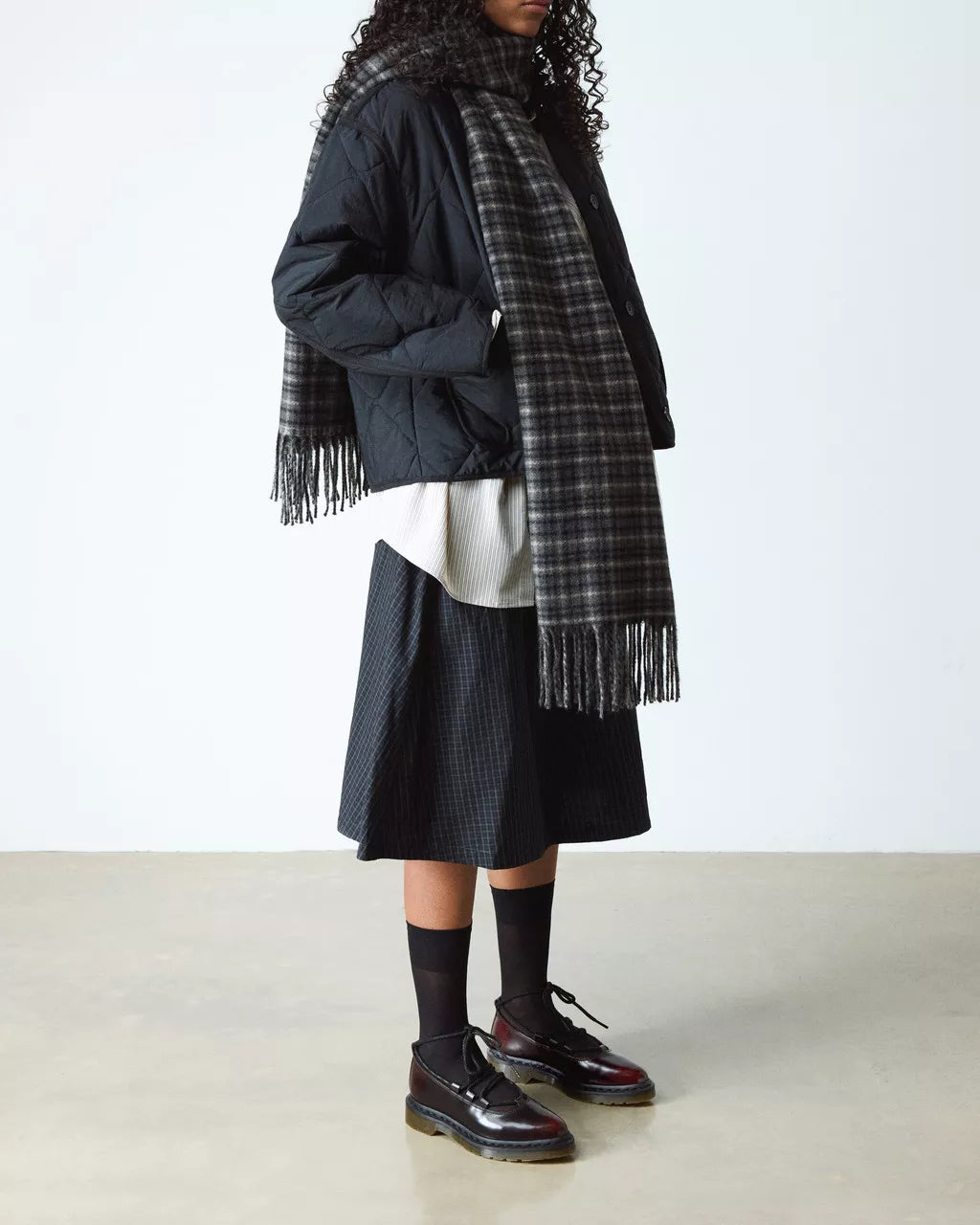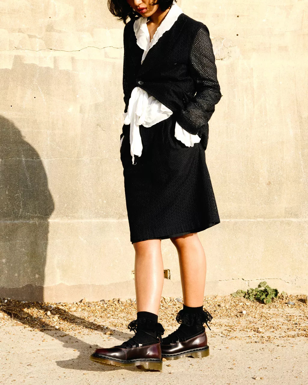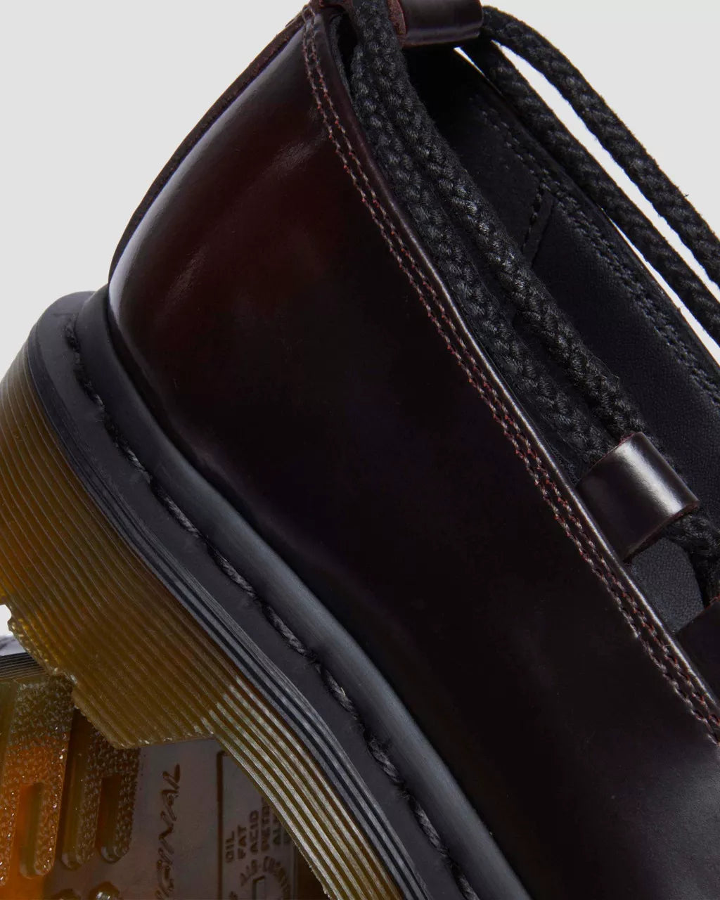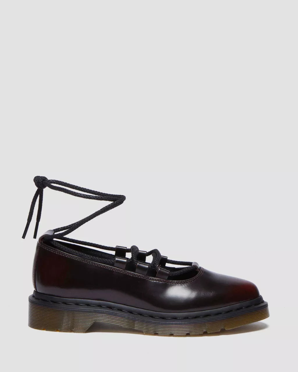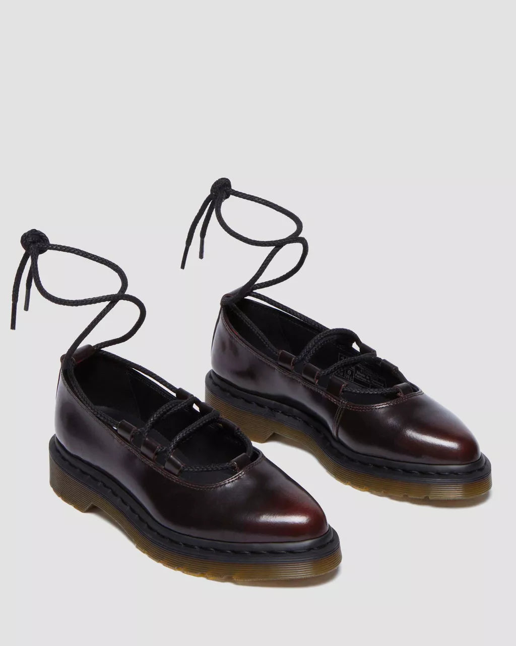 Get to the point. The Elphie ballet flat is our twist on a classic. Less dainty. More Docs. A pointed ballet flat shoe made from two-tone cherry red Arcadia leather, designed to shift in color over time. Fitted with wraparound laces, easily swapped out for a customized look. The tapered sole is marked with DM's signature grooving pattern and secured with black welt stitching.