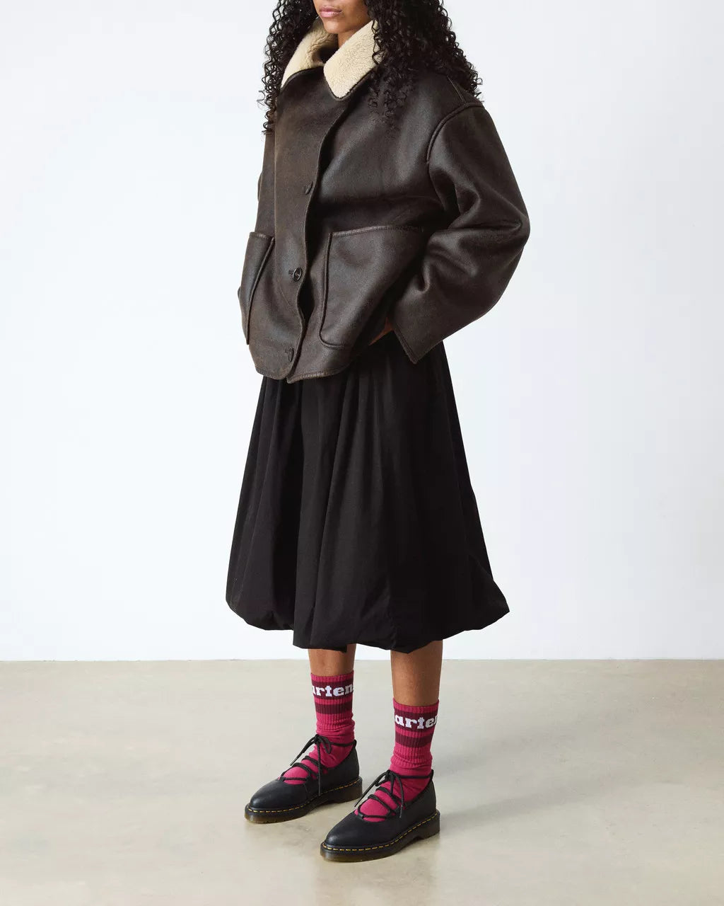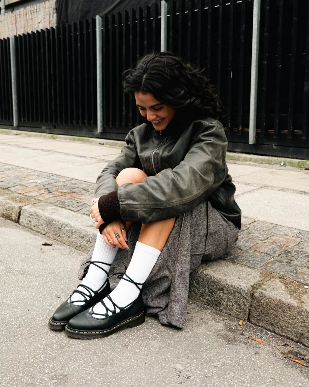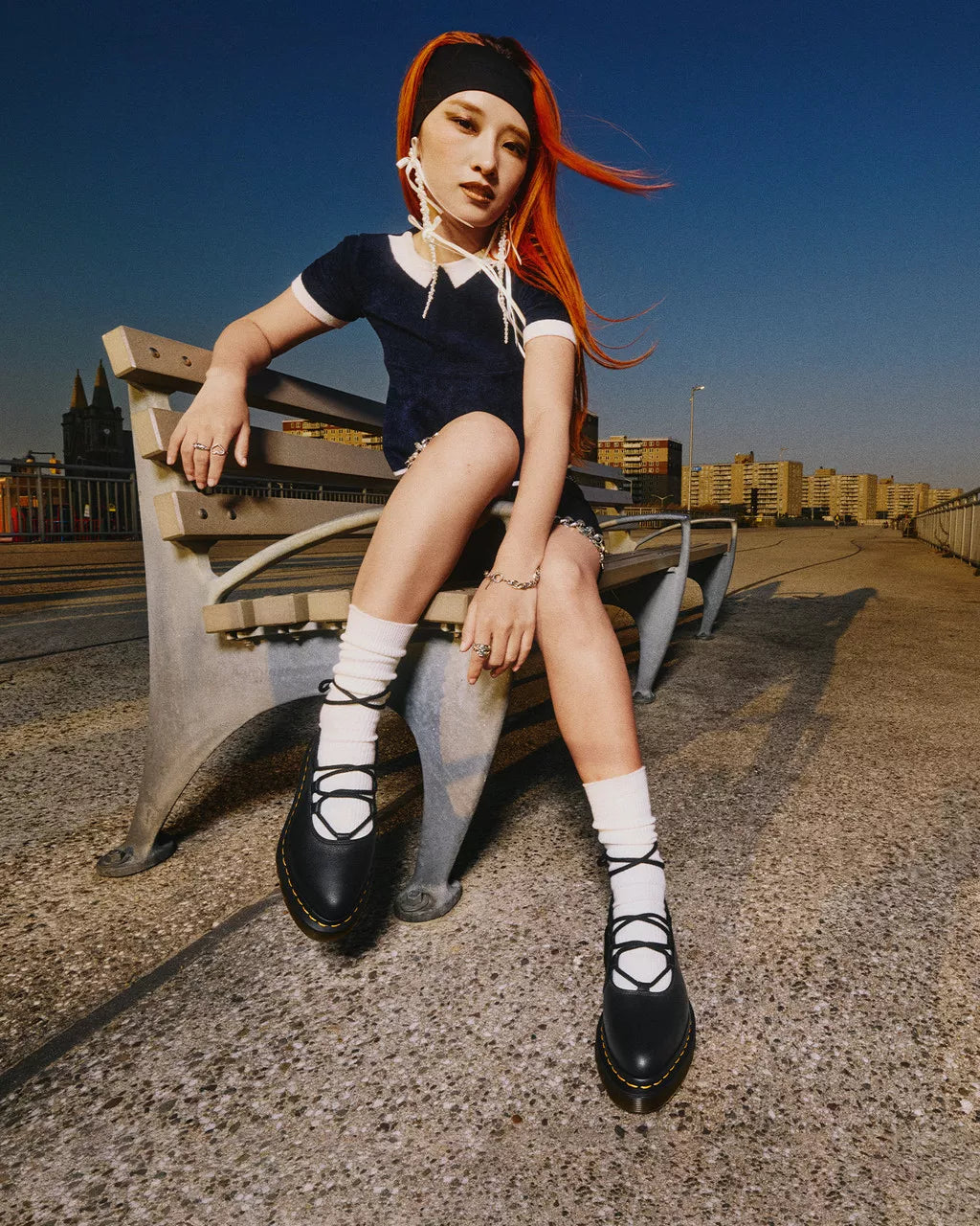 Get to the point. The Elphie ballet flat is our twist on a classic. Less dainty. More Docs. A pointed ballet flat shoe made from soft Virginia leather. Fitted with wraparound laces easily swapped out for a customized look. The tapered sole is marked with DM's signature grooving pattern and secured with yellow welt stitching.