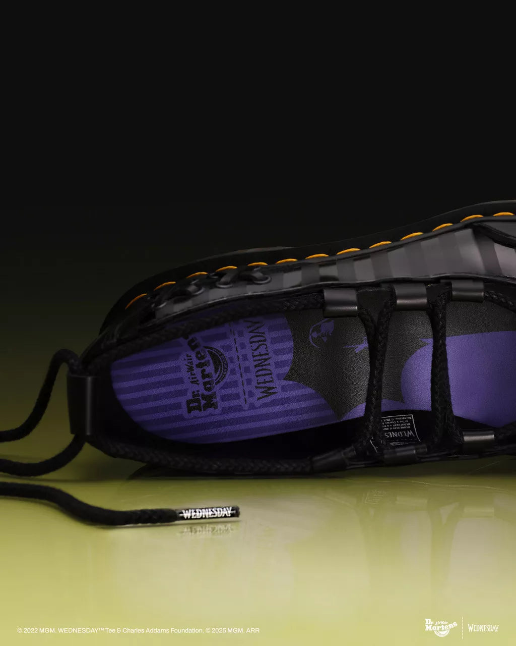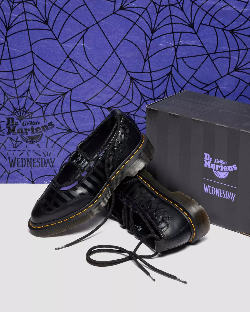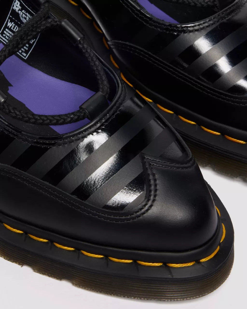The Elphie Wednesday ballet flat reworks a classic shape through the lens of gothic subversion. Built from smooth black leather with tonal stripe detailing, the silhouette features a sharp wingtip toe minus the broguing - stripped back for a cleaner, more sinister feel. Delicate lace and eyelet embellishments frame the heel, while signature wrap-around laces tie at the ankle. Finished with custom aglets stamped with the Wednesday logo, a debossed heel mark, and our iconic yellow welt stitching on a stacked sole made for striding ahead of the crowd.