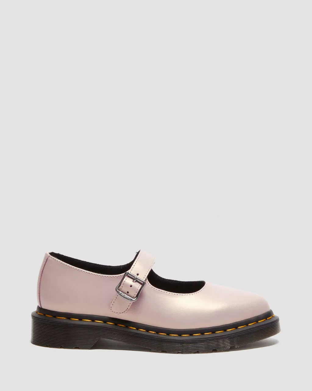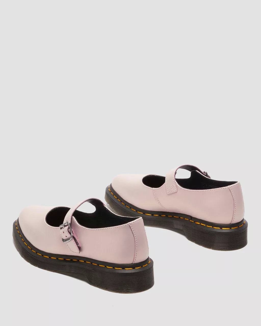 Get to the point. The Elphie ballet flat is our twist on a classic. Less dainty. More Doc’s. A pointed ballet flat shoe made from powder pink Shift leather with an iridescent finish. Fastened with a single strap with a DM’s branded buckle. The tapered sole is marked with DM’s signature grooving pattern and secured with yellow welt stitching.