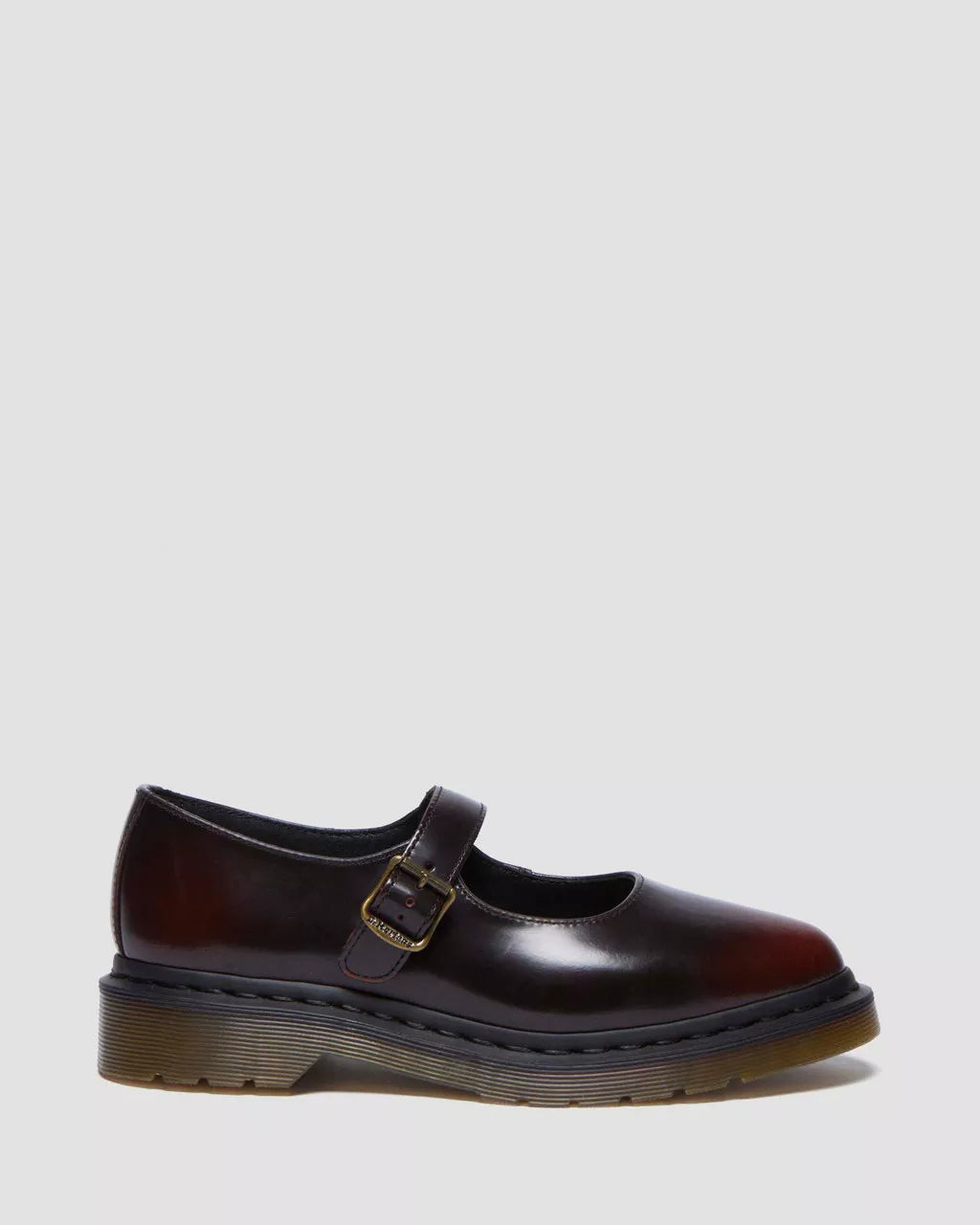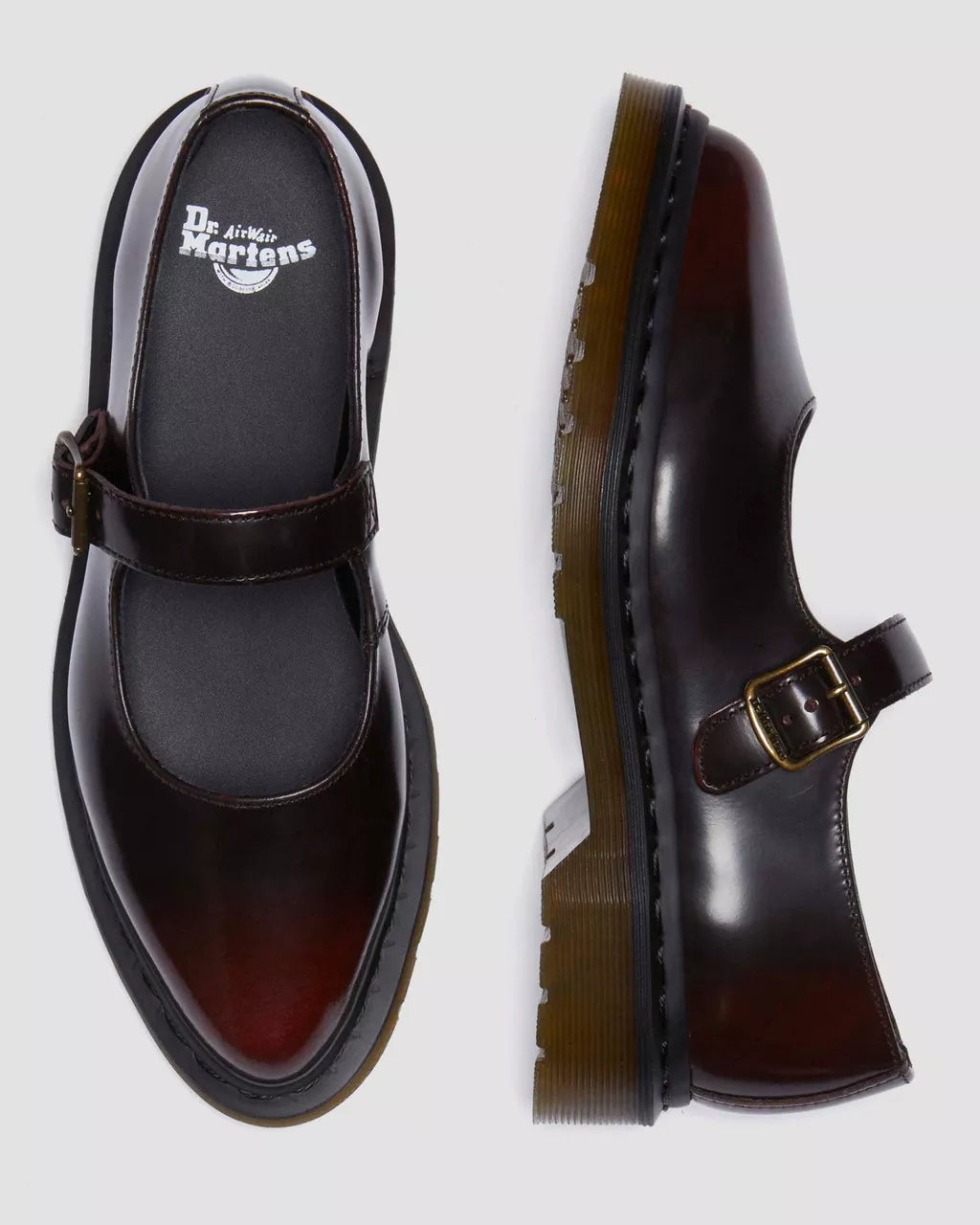Get to the point. The Elphie Mary Jane shoe is our twist on a classic. Less dainty. More Doc’s. A pointed ballet flat shoe made from two-tone cherry red Arcadia leather designed to shift in color over time. Fastened with a single strap with a DM’s branded buckle. The tapered sole is marked with DM’s signature grooving pattern and secured with black welt stitching.