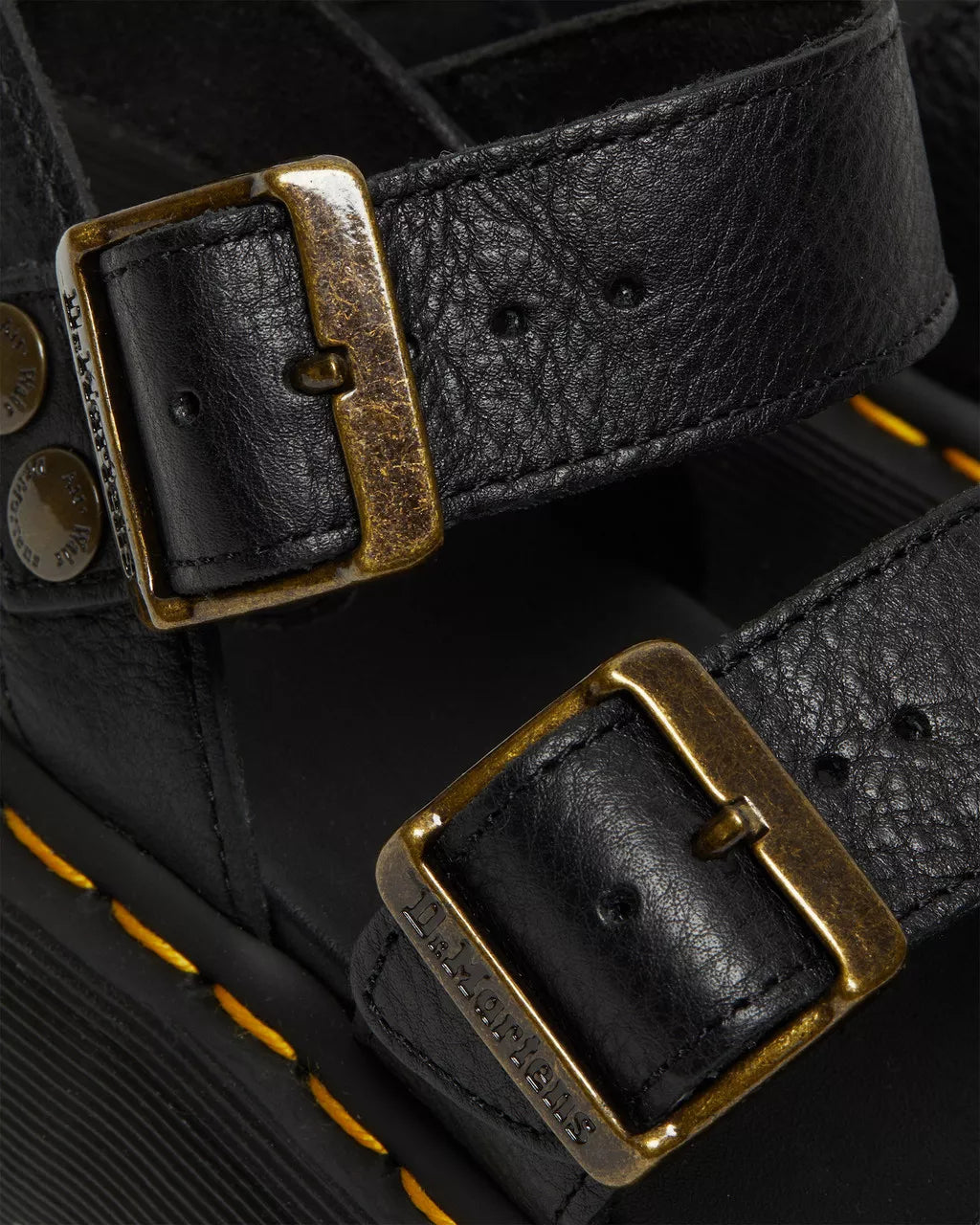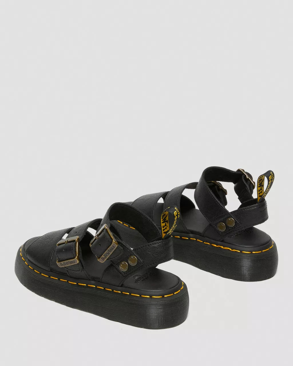 We've reinvented our headlining Gryphon sandal for the new season. Now standing on a high-rise Quad sole, the Gryphon Quad is manufactured from soft Pisa leather with rugged brass hardware. Welted, well-engineered and packed with Docs DNA — the sandals are finished with yellow welt stitching and an AirWair heel loop.Pisa is a medium-weight milled Nappa leather with a soft tumbled handle and richly pigmented waxy finishConstruction - Made with our Goodyear-welted lines are heat-sealed at 700˚C and reinforced with our signature welt stitchPlatform height: 1 5/8 in Heel height: 2 inFootbed - Slimmer and a more tapered toe shape
