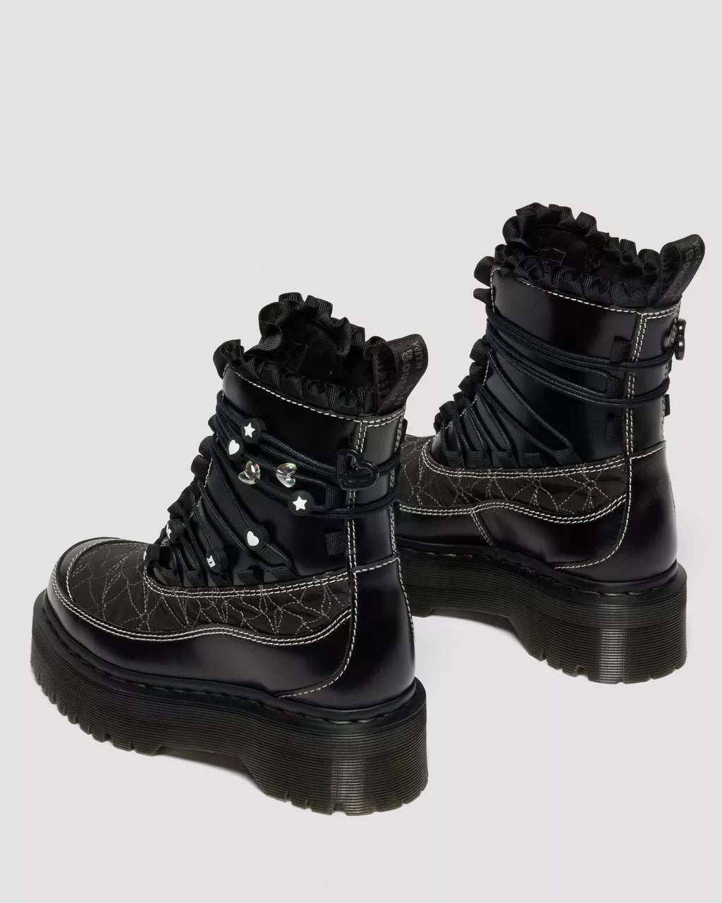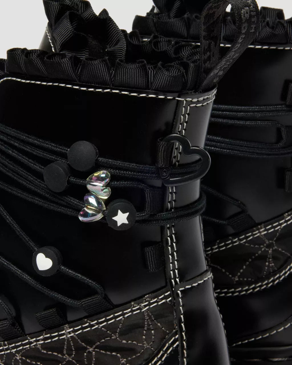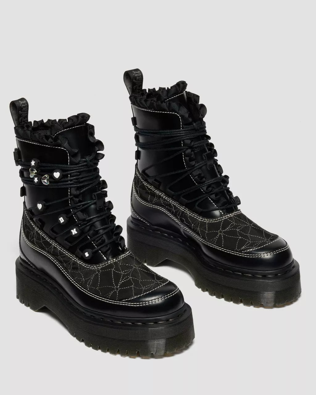 Framed with flourishes. The Jadon Frill boot takes intricate decorative accents and fuses them with the toughness of a classic DM’s silhouette. In Polished Smooth leather that’s hard-wearing and durable, we softened the boot with frills around the ankle and upper. White bow stitching across the sides and vamp. And delicate wraparound laces threaded with silver hearts. The boot is sealed with monochrome welt stitching and a black Quad sole for extra height.