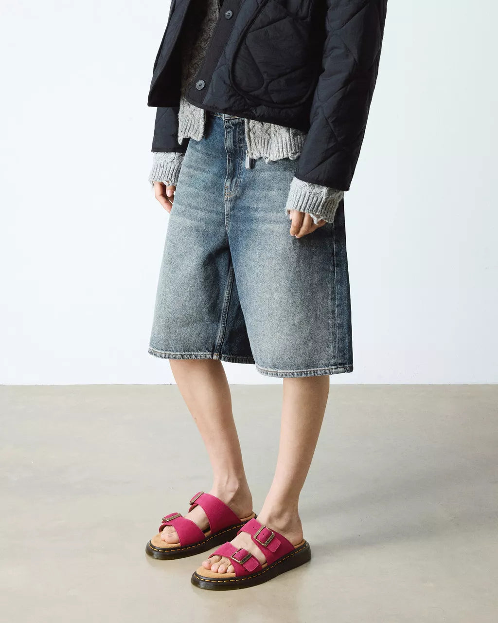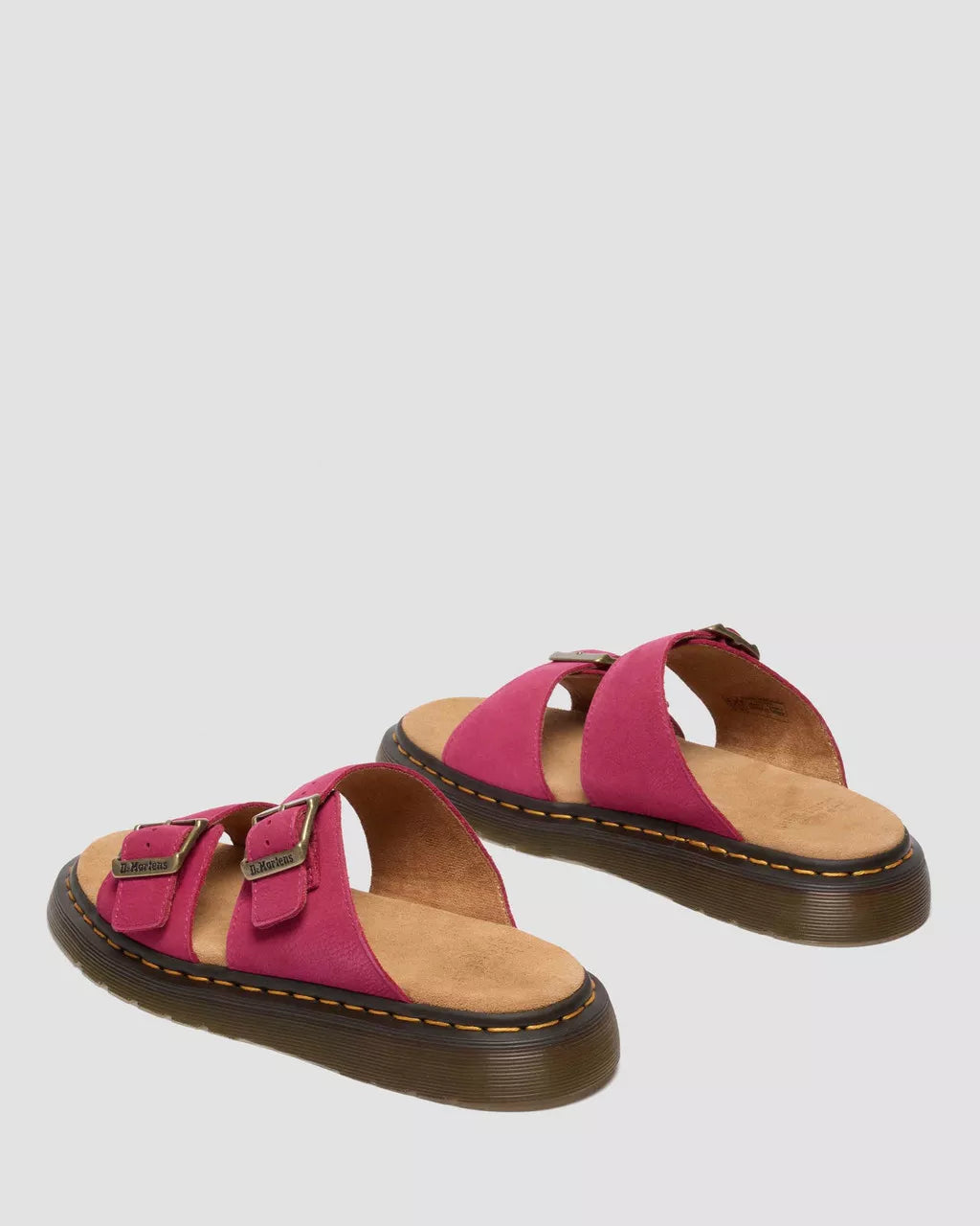 Freshened up in fuschia. The Josef sandal is back in a hot pink hue that transcends all seasons. Milled Nubuck leather gives the sandal a softened edge. While branded antique gold buckles, yellow welt stitching and a trans Shore sole bring the sandal’s DM’s identity into full focus. We've chosen this leather specifically for its depth of colour. You might find some of the dye transfers, so try and wear with darker colours if you can.