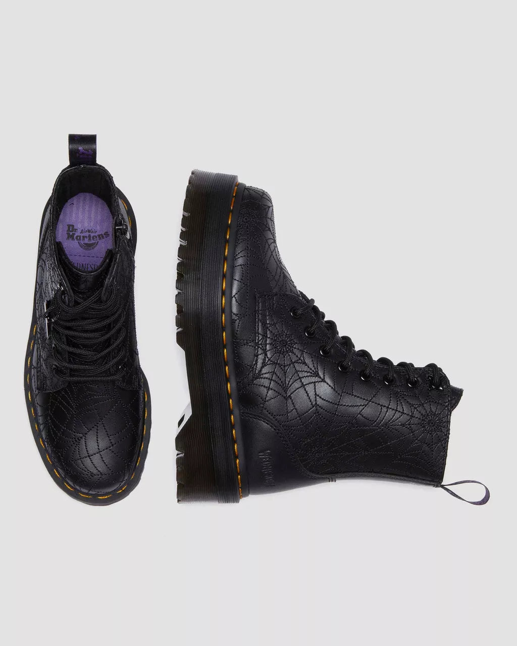 Outcasts are in. This limited-edition version of our DM’s x Wednesday Jadon boot is made with Nappa Lux leather with embroidery inspired by the stained-glass window in Wednesday and Enid’s bedroom at Nevermore Academy. The laces are also decorated with a removable stained-glass window charm, and the backstrap of the boot is printed with the Nevermore Academy logo. The boot’s sock is purple with a print of Wednesday with her umbrella, and the boot’s heel is marked with an embossed version of the Wednesday logo. The Quad sole is secured with our yellow welt stitching, and the heel loop is signed with purple script.Born in 2013, the Jadon boot is our fearless 8-eye silhouette with a formidable platform sole and unmistakable Dr. Martens DNA. Stand taller. Feel bolder.Nappa Lux is a classic Nappa leather — soft and smooth to the touch. Clean with a damp cloth and care with Dr. Martens shoe polish or Wonder Balsam. Built to embolden. Our towering Quad sole takes our silhouettes to new heights — for people who aren't afraid to stand tall.Our Goodyear-welted lines are heat-sealed and reinforced with our signature welt stitch