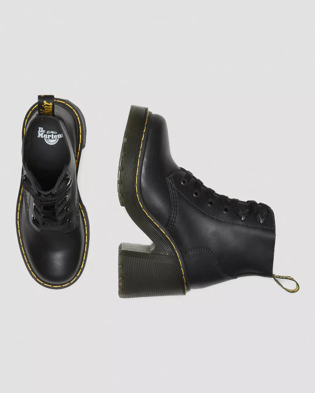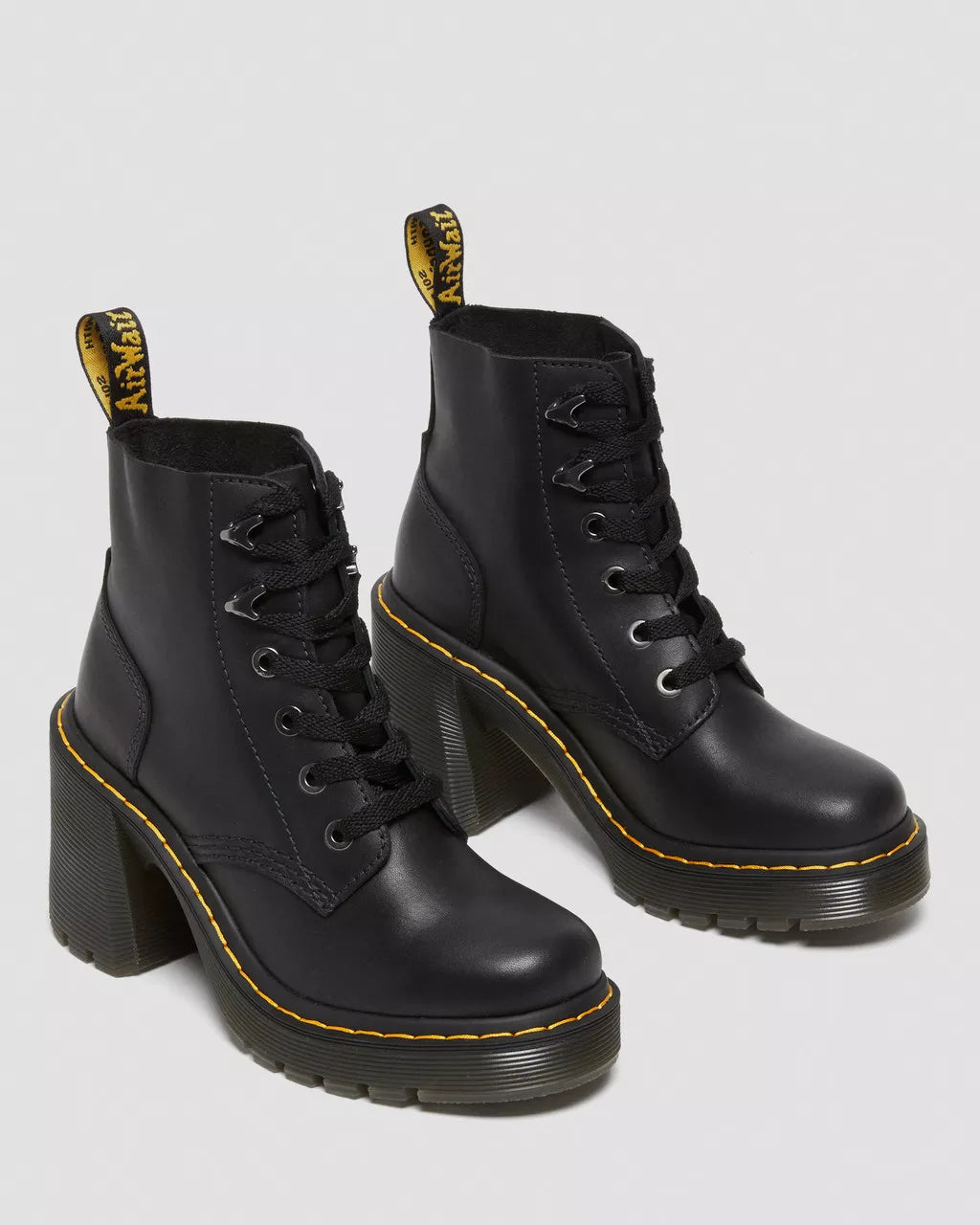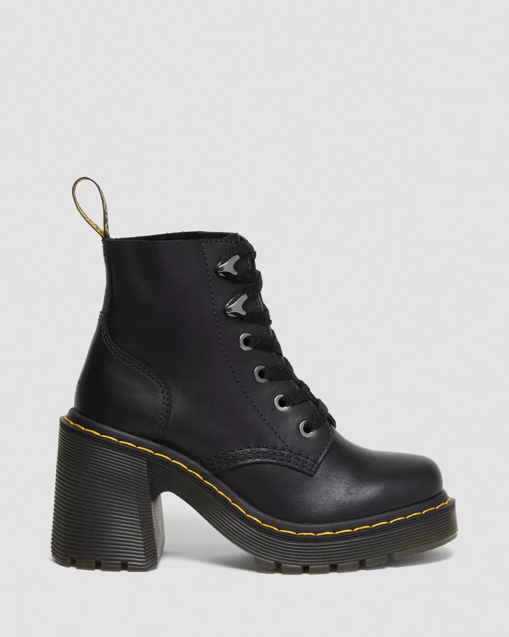 The Jesy. A maximum impact 6-eye boot. Constructed from smooth, full-grain Sendal leather on our towering 3 3/4 inch Arden flared heel. Completed with an external heel counter, arrow-shaped ski hooks, gunmetal eyelets and an unmistakable yellow Goodyear welt-stitch. Signed with our scripted heel loop.Sendal is a semi-aniline, natural-looking nappa leather with a smooth full-grain finishConstruction - Made with our Goodyear-welted lines that are heat-sealed at 700˚C and reinforced with our signature welt stitchSole Height - Platform height: 1 1/8 in; Heel height: 3 3/4 inStandard last - Recommended for all feet, but perfect for average to wide width feet