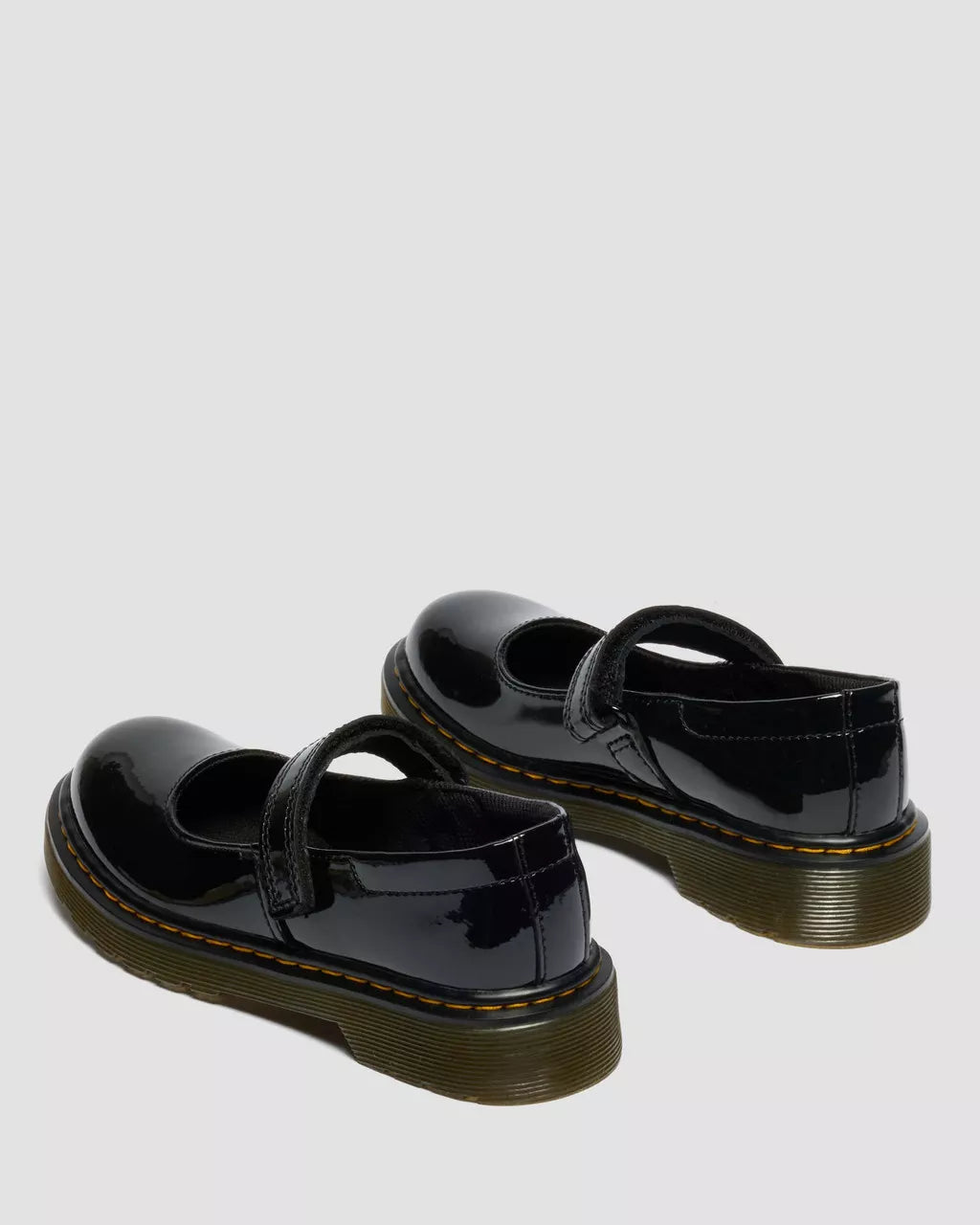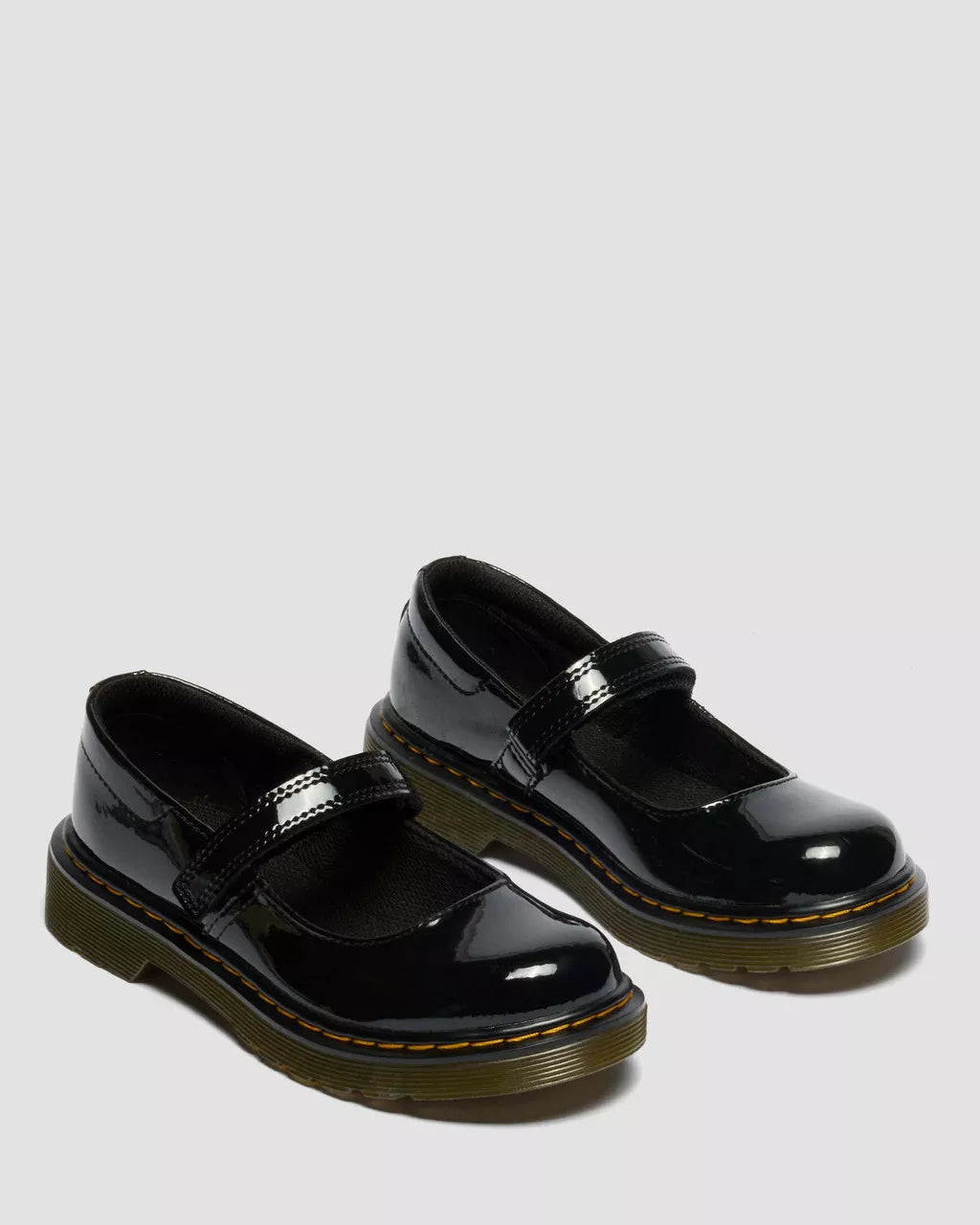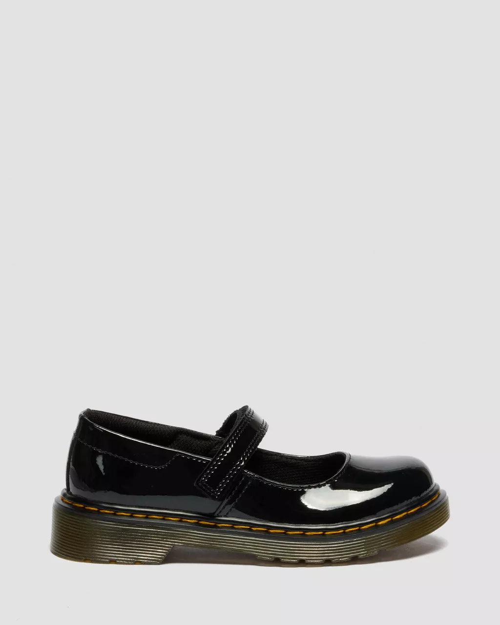 What's better than a sweet, innocent Mary Jane shoe? One that's made in the classic Dr. Martens style. We've dressed up the quintessential grade-school shoe with a T-bar hook-and-eye strap and glossy patent leather. Because what smart girl wants to wear a plain old Mary Jane when they could rock the sass of Dr. Martens—yellow stitching, side grooves and all?Great school stylePadded collar and flexible cemented sole ensures comfort and support for growing feetMade with the iconic Dr. Martens air-cushioned soleSecure hook-and-eye fasteningCushioned insole for extra comfort All the classic Docs DNA, like side grooves and visible stitching