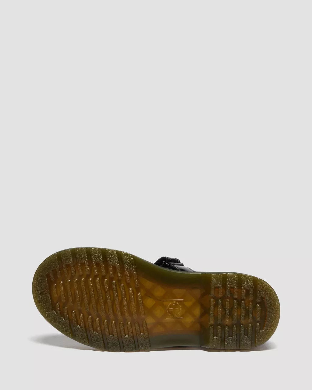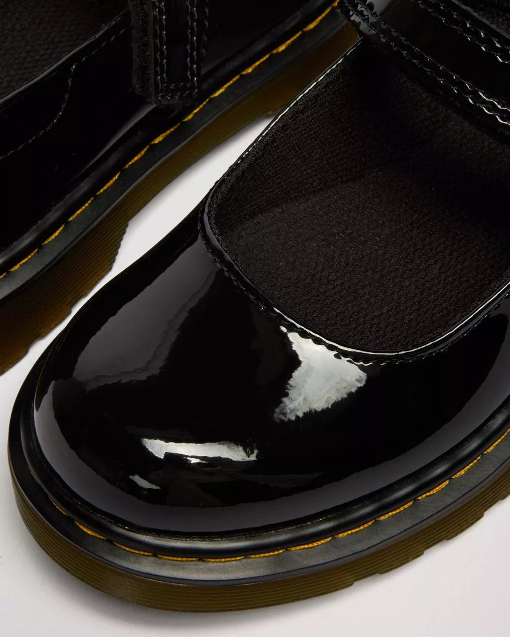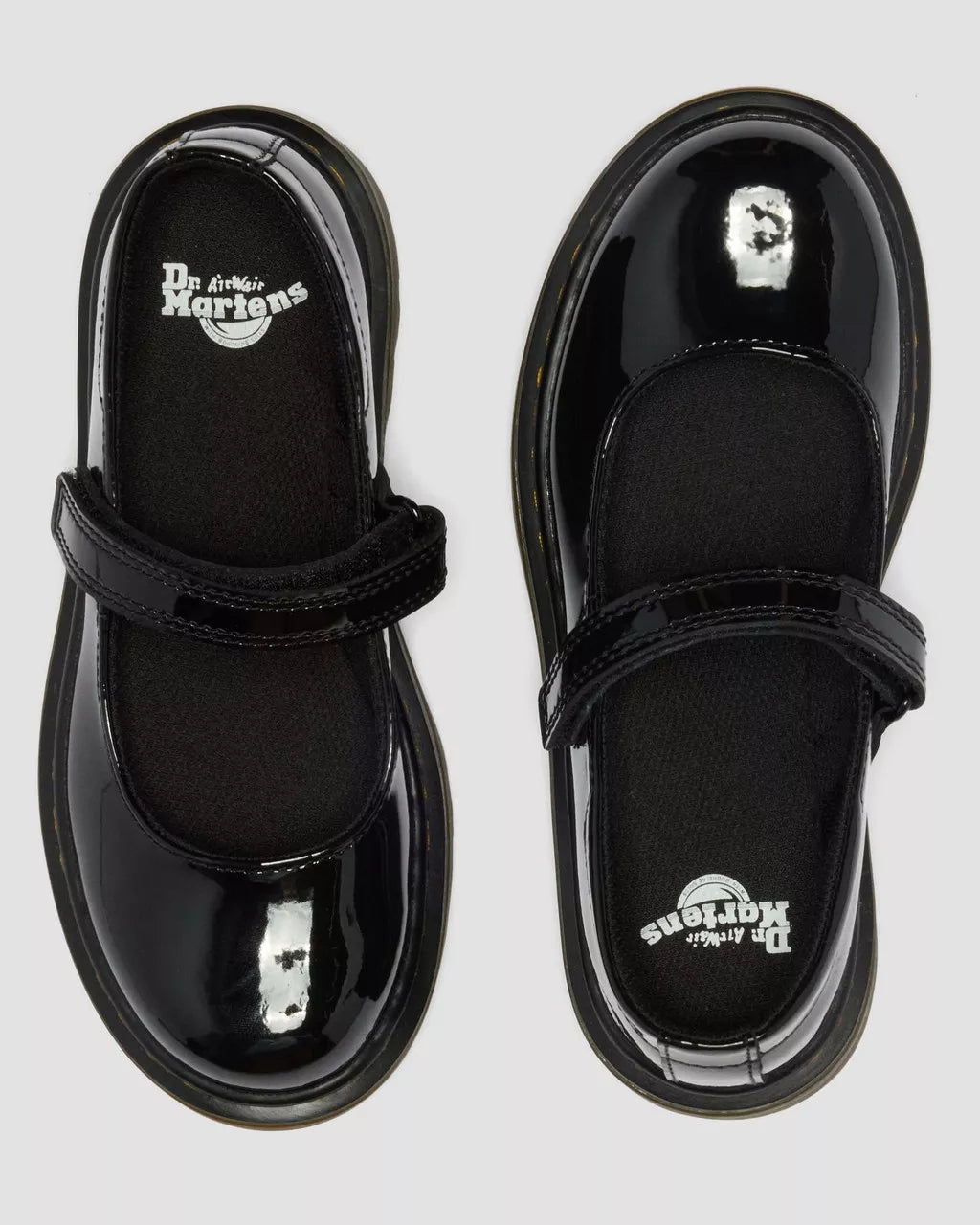 What's better than a sweet, innocent Mary Jane shoe? One that's made in the classic Dr. Martens style. We've dressed up the quintessential grade-school shoe with a T-bar hook-and-eye strap and glossy patent leather. Because what smart girl wants to wear a plain old Mary Jane when they could rock the sass of Dr. Martens—yellow stitching, side grooves and all?Great school stylePadded collar and flexible cemented sole ensures comfort and support for growing feetMade with the iconic Dr. Martens air-cushioned soleSecure hook-and-eye fasteningCushioned insole for extra comfort All the classic Docs DNA, like side grooves and visible stitching