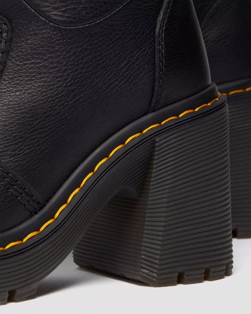 Statement-making from knee to toe. The Kasey boot is a towering new silhouette stacked on a flared Ardern heel with soft leather that extends far up the leg. An unmissable boot that demands attention no matter how it's styled. Signed with our scripted heel loop and yellow stitching. Virginia is a soft, fine-grain leather that’s treated to make it smooth and supple. Clean with a damp cloth and care with Dr. Martens Shoe Polish.Made with comfortable, durable cemented construction.