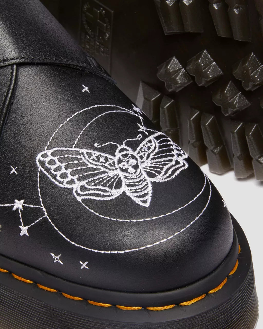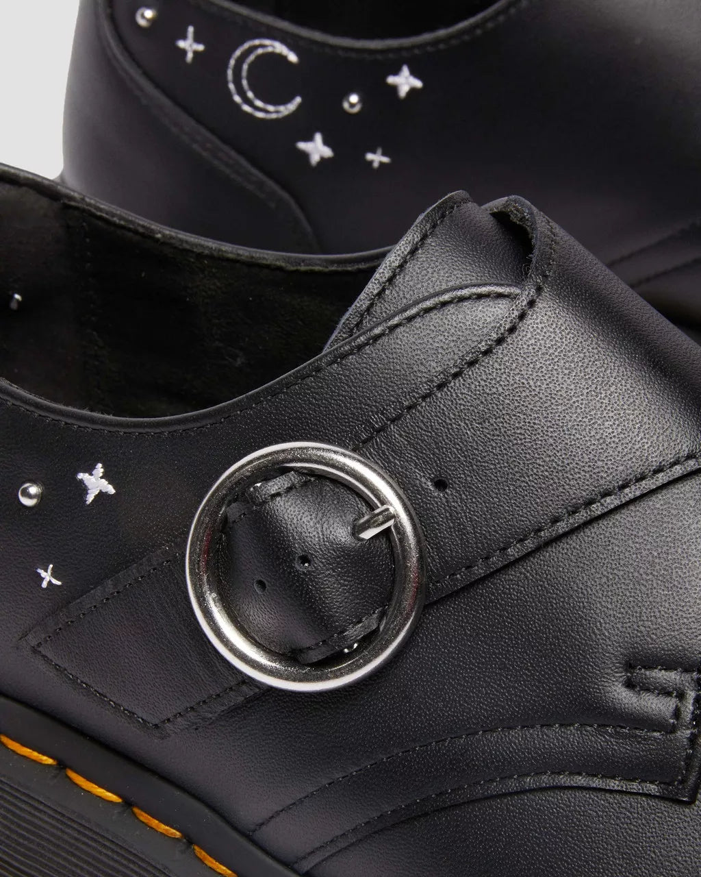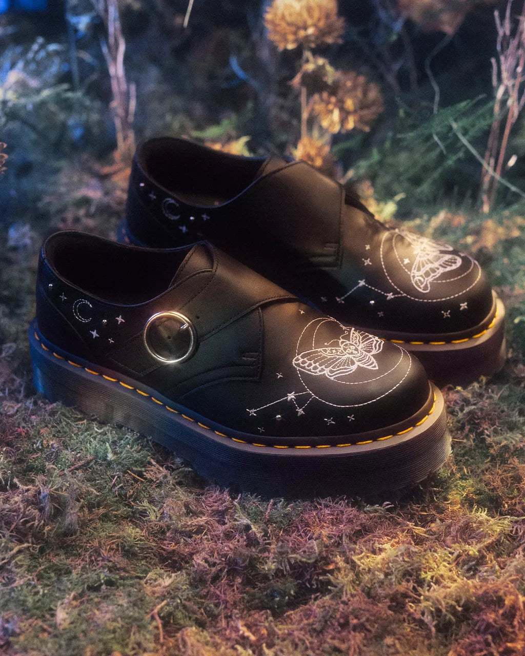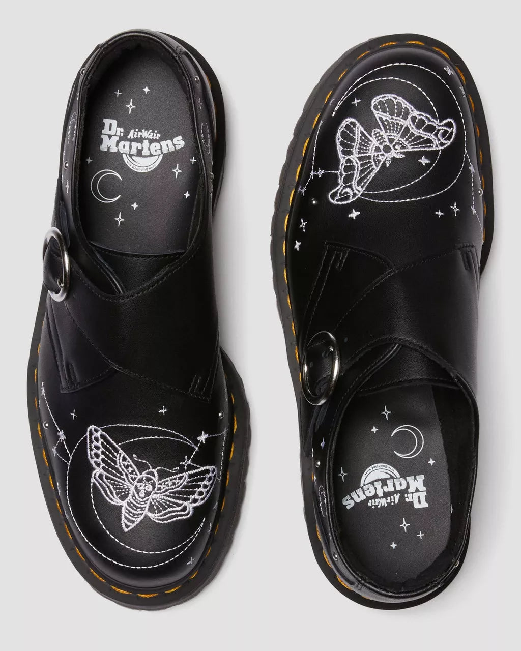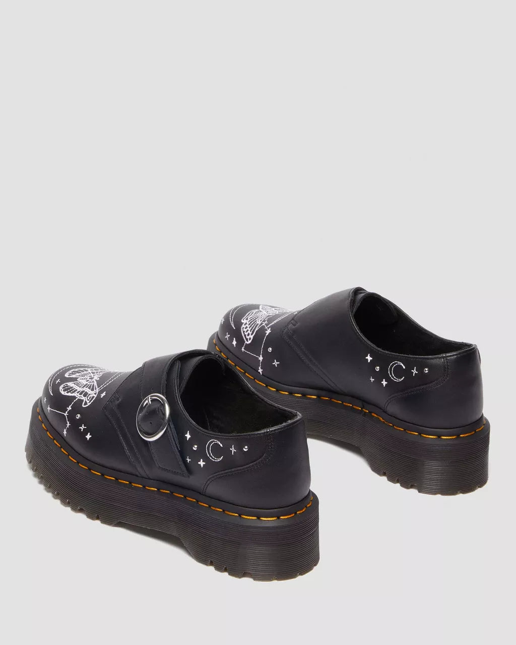 Embroidered with a moth-load of gothic energy. In Softy T leather, the Monk Strap shoes get a nocturnal update in our Celestial Moth collection. The low-silhouette shoes feature an off-centre buckle fastening that blends neatly into the stitched star and moth motifs. Whilst the embroidered detailing offers a striking contrast stitch, the shoes are finished with our signature yellow stitching on top of our stacked Quad platform sole.
