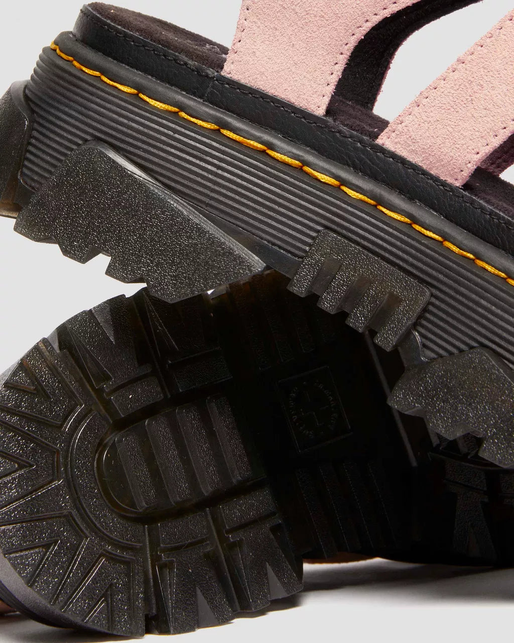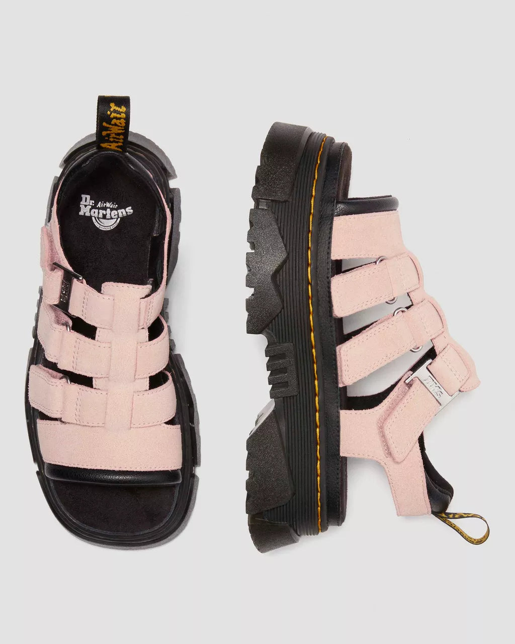 Comfortable getting noticed. The Mattison 3 Strap sandal is built on our unmissable new Mattison platform sole. The hybrid sole has a comfortable EVA midsole and an exaggerated PVC tread that extends up the side walls to create a jagged pattern. The sole is also marked with signature DM's grooving and yellow stitching. The suede-covered foam footbed provides extra cushioning on long days. Each strap is adjustable to help you find the perfect fit, and the padded ankle strap is tagged with our black and yellow heel loop.