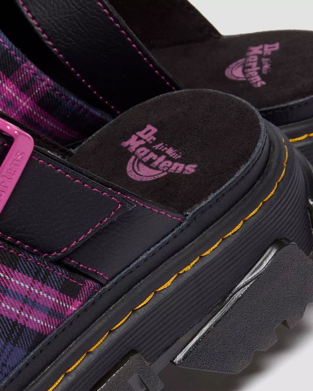 Slip on some standout tartan. Our Mattison Slide sandal stands on an unmissable platform sole a comfortable EVA midsole and an exaggerated PVC tread that extends up the side walls to create a distinctive jagged pattern. The upper combines pink woven tartan with black Athena leather detailed with pink border stitching and a pink buckle to adjust your perfect fit. Our suede-covered foam footbed keeps you comfortable on long days. And the sole is marked with our unmistakable yellow stitching.