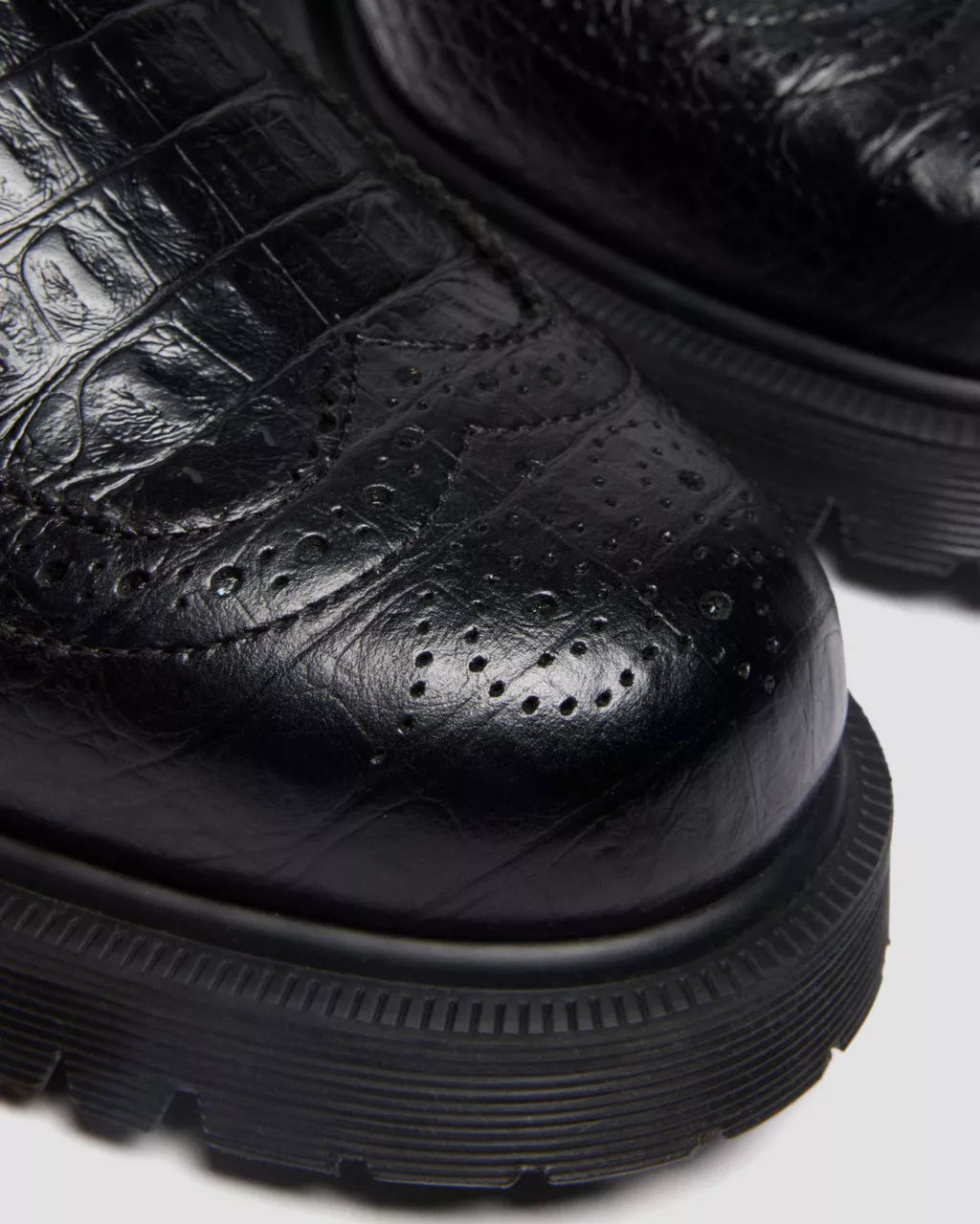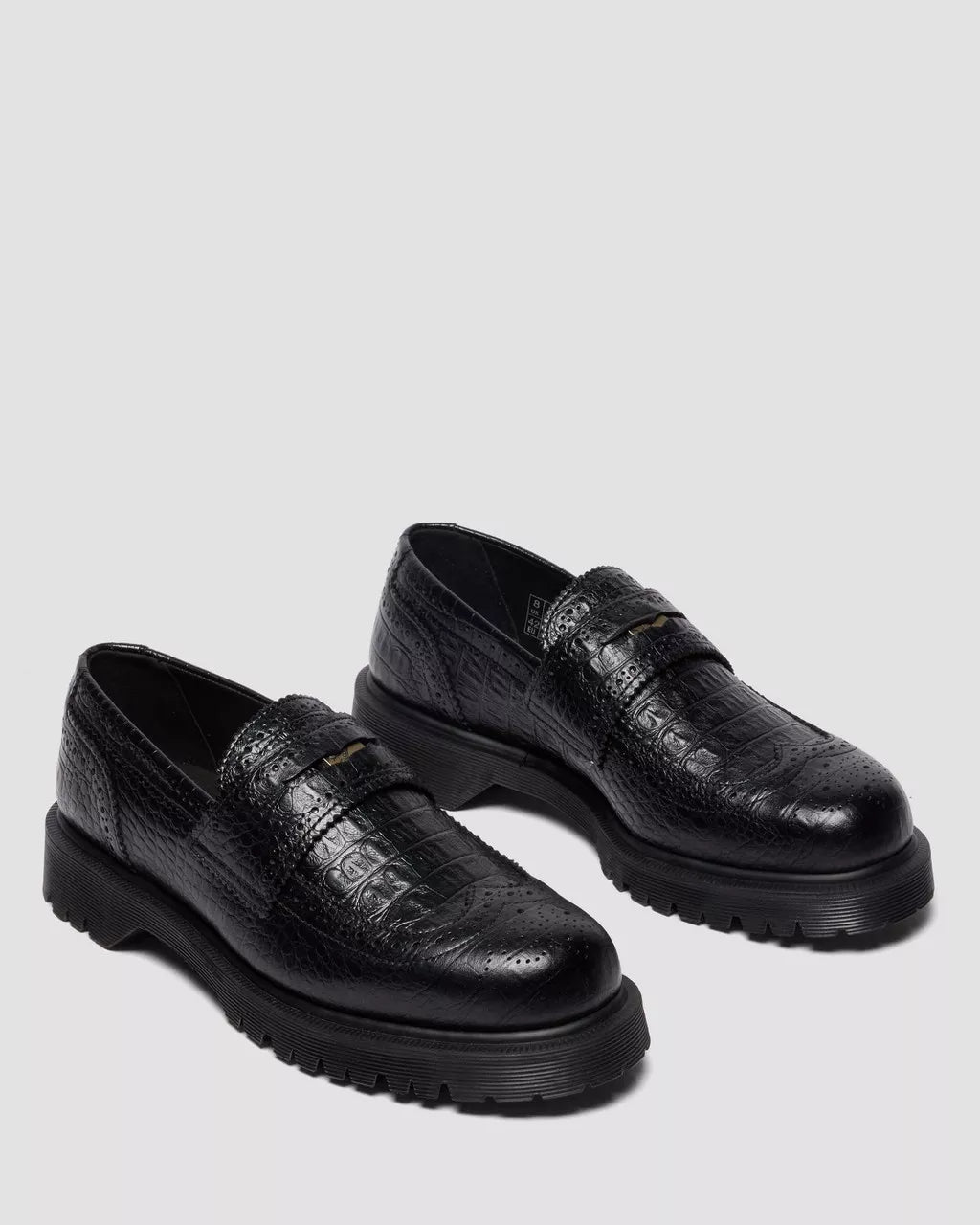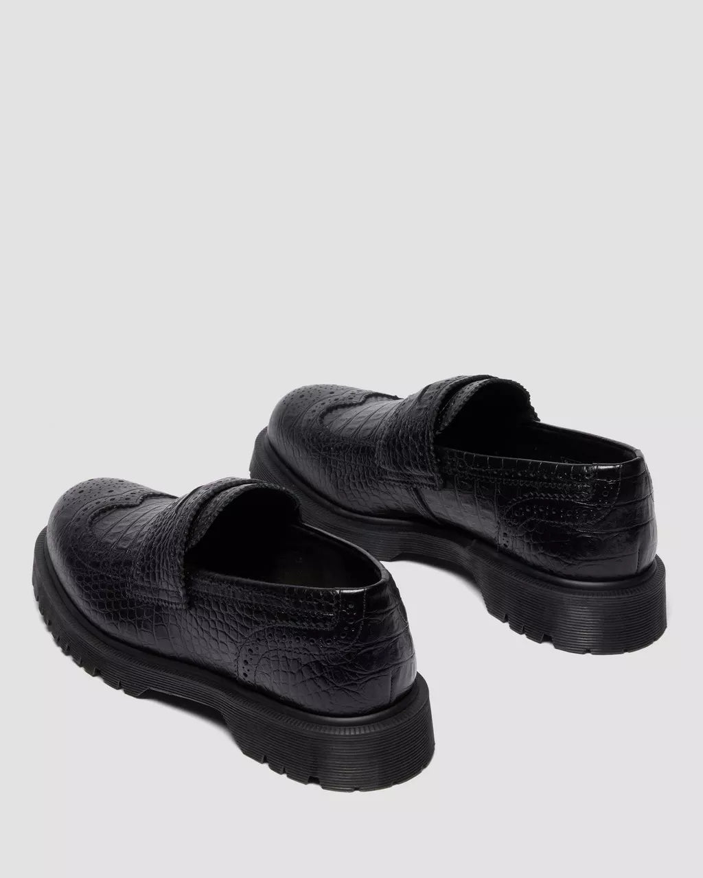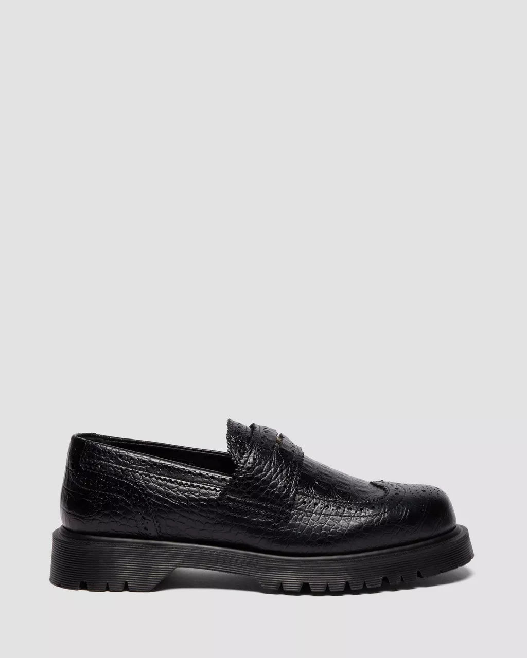 Refinement through texture. The Penton Brogue loafer adds new depth to a traditional DM’s silhouette. Renewed in heavyweight Analine Croc Emboss leather, it takes on pattern and polish for a sharper look – and has brogue detailing across the upper. With a leather lining and custom signet penny, the shoe has monochrome welt stitching and an extra height black Bex sole.