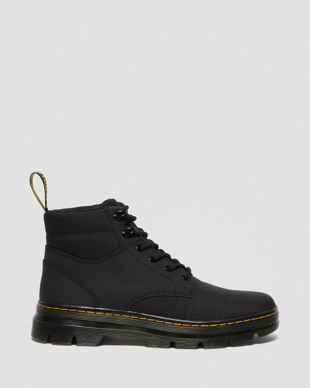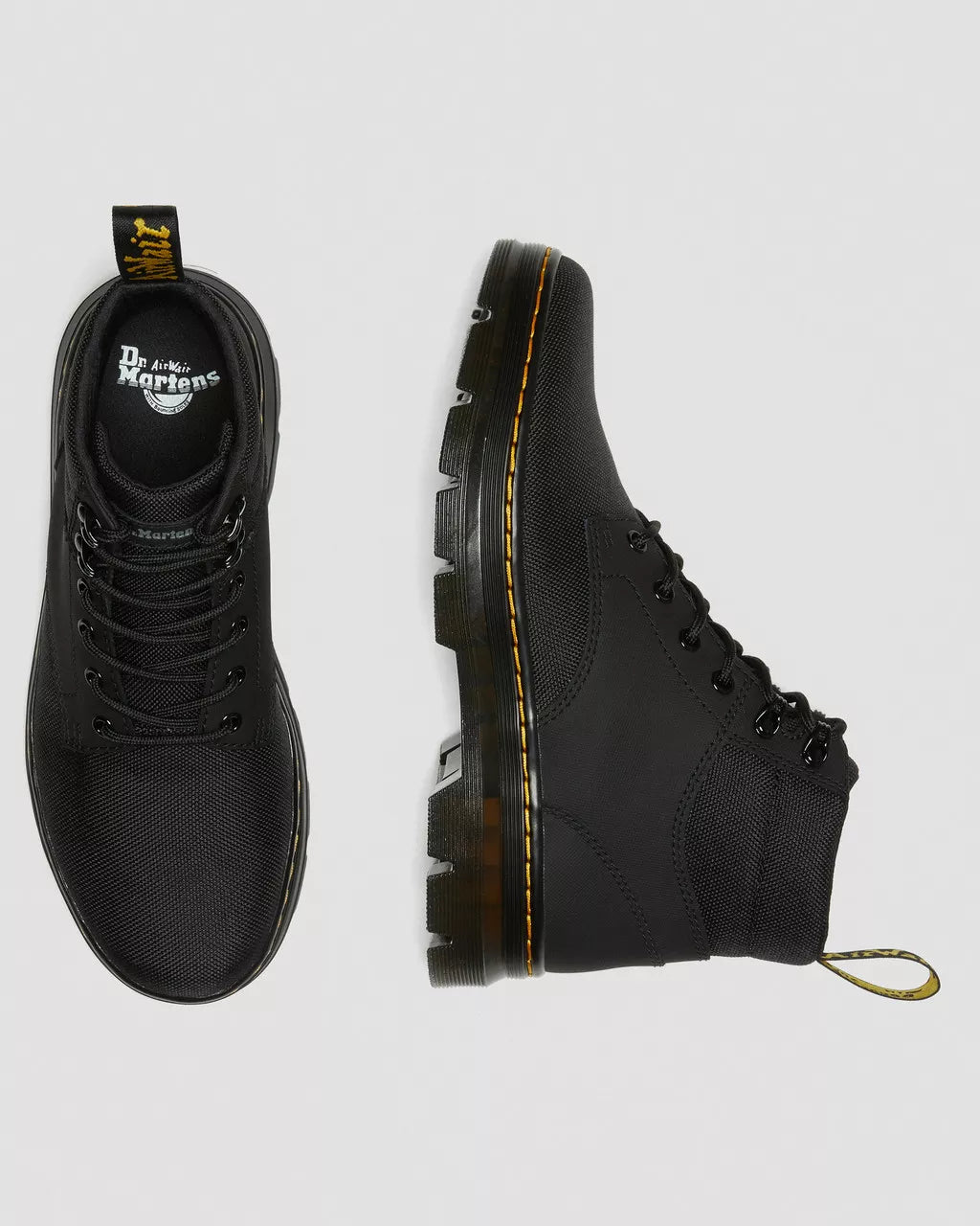 Built for the everyday. Sitting on a stacked, rugged outsole and made with Extra Tough 50/50 material, these boots offer optimum comfort from the first step. Finished with yellow stitching and a black and yellow heel loop. Extra Tough 50/50 is an extra tough, synthetic woven fabric with exceptional strength and elasticity. Made with 50% recycled plasticCore Dr. Martens DNA: grooved edges, an AirWair heel loop and visible stitchingMade with a comfortable, durable cemented construction