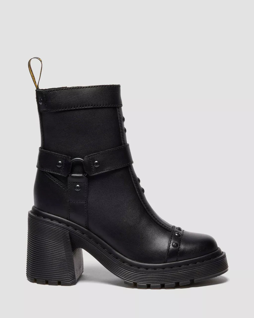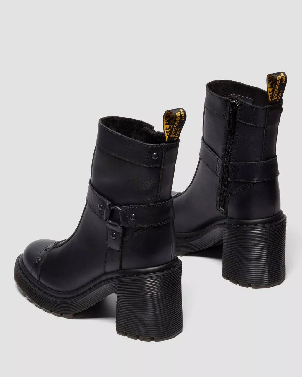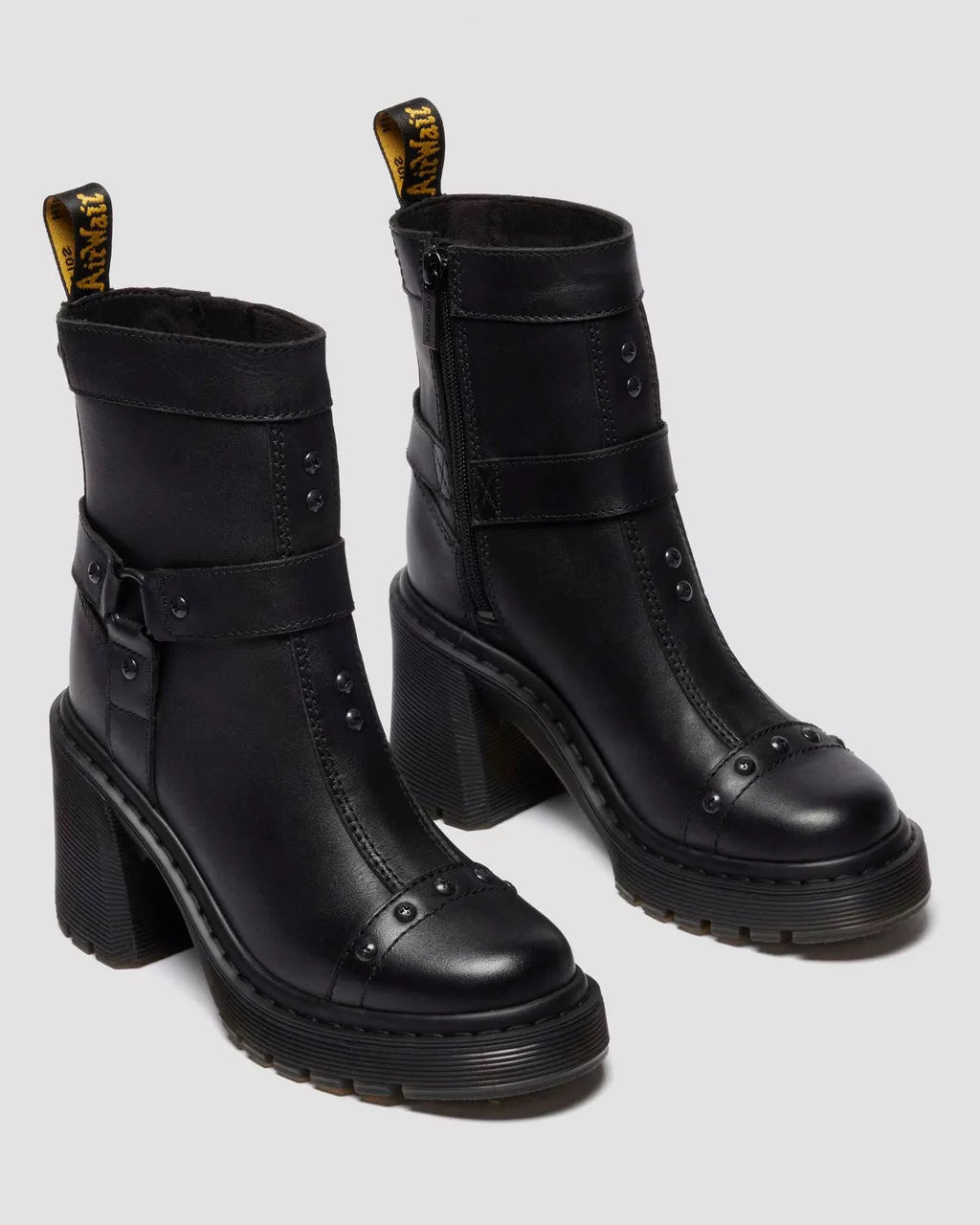 Heeled, harnessed and headstrong. The Spence Harness boot embodies our relentless attention to detail and craft. Built with Sendal, a smooth yet rugged leather, we upgraded the boot with a wraparound harness for extra edge and an additional leather placement on the toe that exaggerates the silhouette’s shape. Monochrome stitching runs across the upper and welt, and signature DM’s detailing includes our scripted heel loop and branded zip. The boot is stacked tall on a black grooved sole and towering flared heel for maximum impact.
