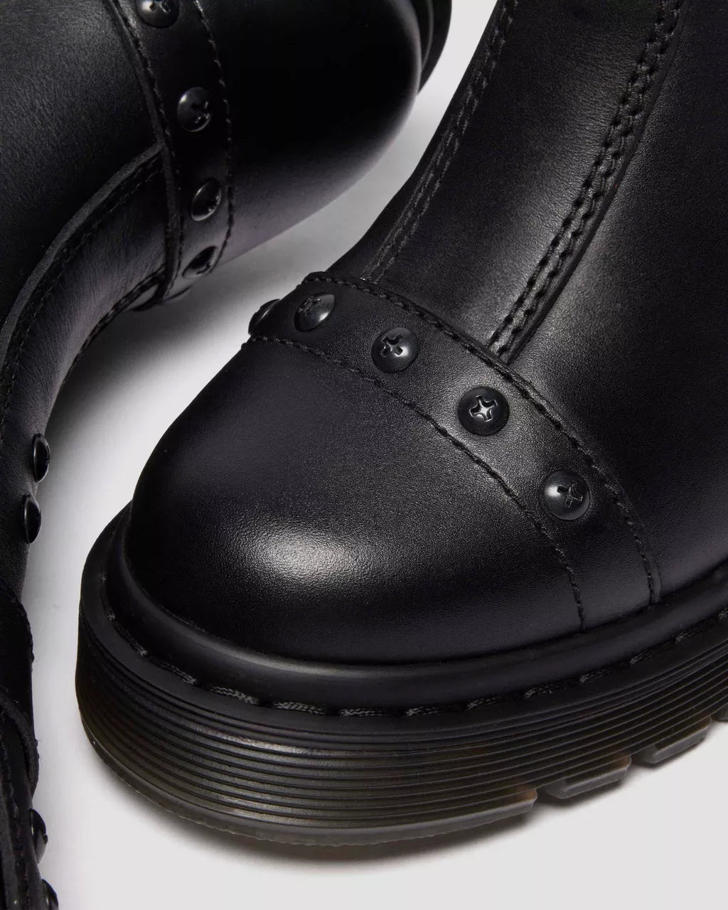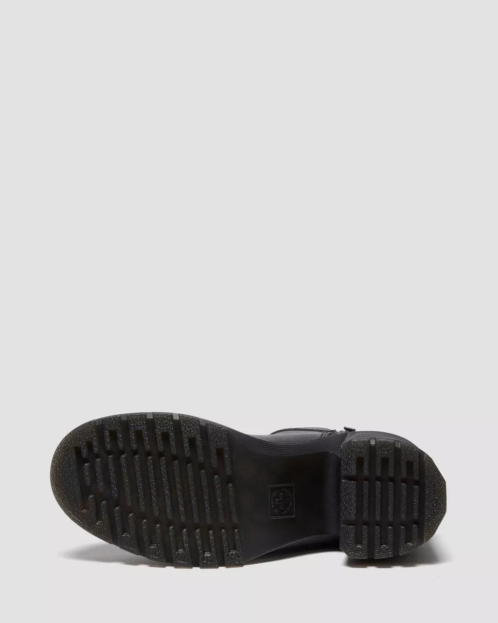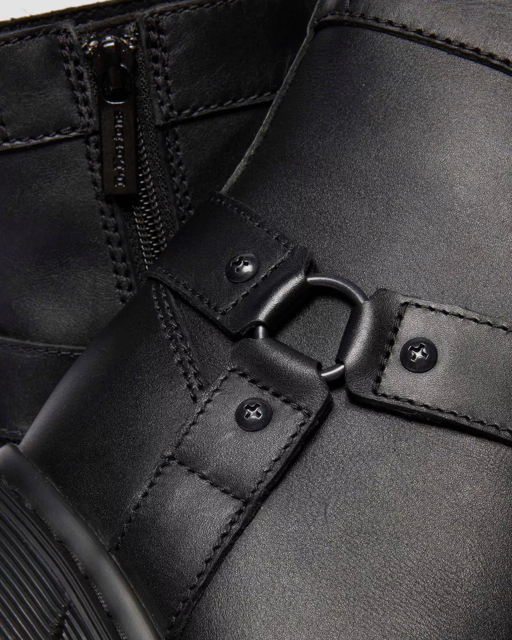 Heeled, harnessed and headstrong. The Spence Harness boot embodies our relentless attention to detail and craft. Built with Sendal, a smooth yet rugged leather, we upgraded the boot with a wraparound harness for extra edge and an additional leather placement on the toe that exaggerates the silhouette’s shape. Monochrome stitching runs across the upper and welt, and signature DM’s detailing includes our scripted heel loop and branded zip. The boot is stacked tall on a black grooved sole and towering flared heel for maximum impact.
