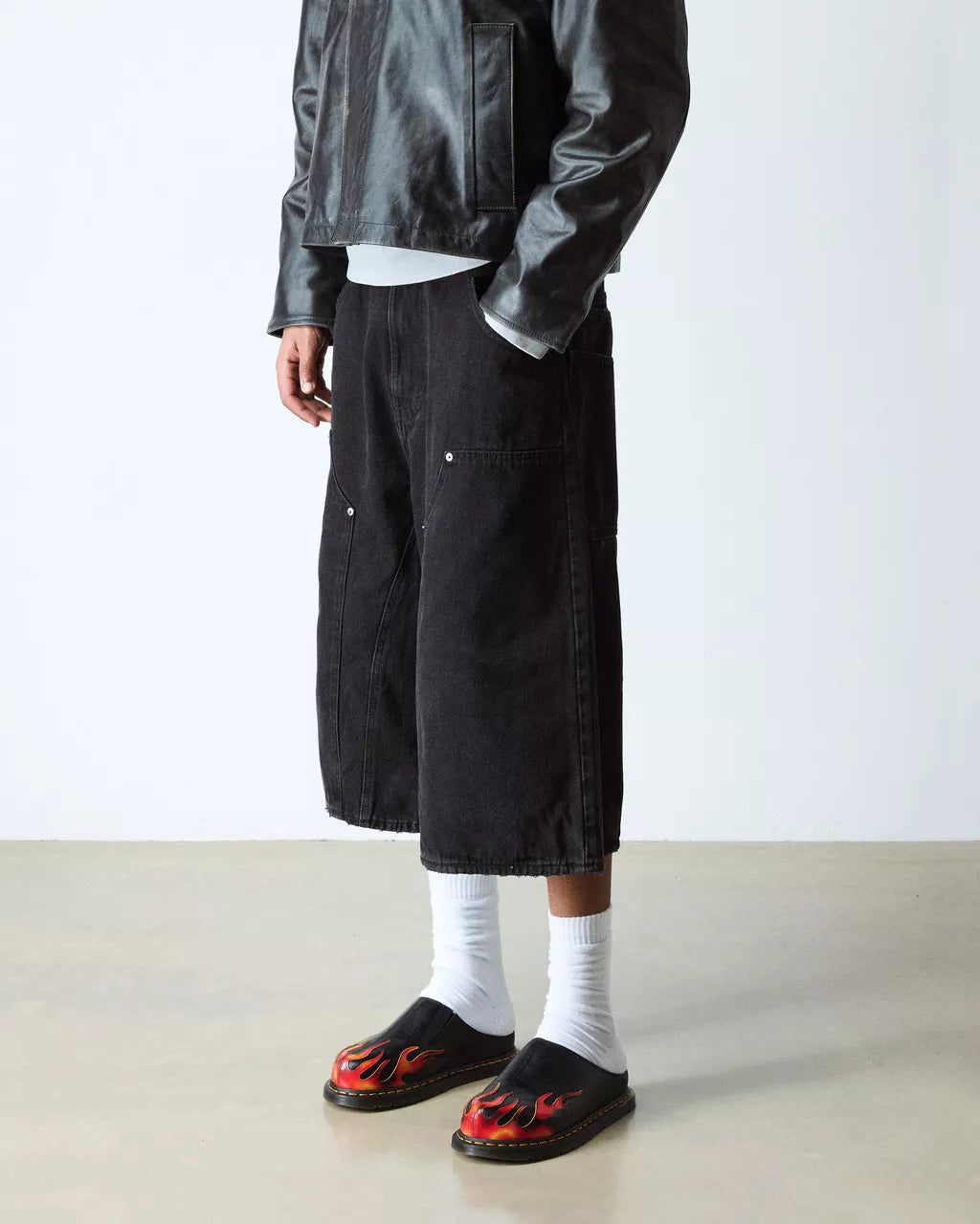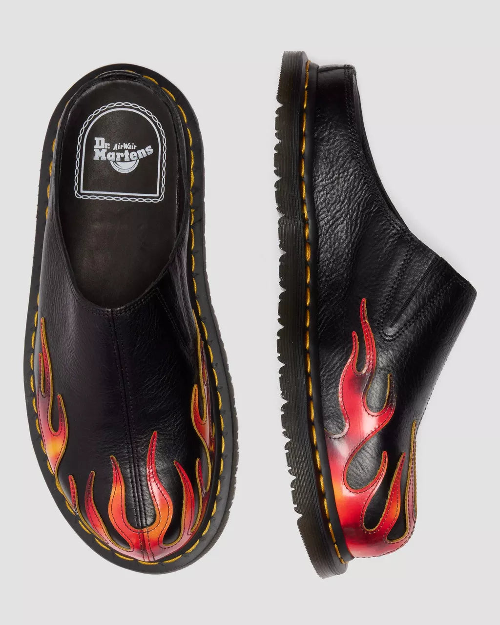 Traditional techniques that dial up the heat. The San Flame mule is a fiercely confident adaptation of a smash hit DM’s silhouette. Intricately crafted flames climb the upper in Multi Arcadia, a rub off leather that reveals three different colors – giving each mule a unique look. The flames are applied on Overdrive, a naturally oily leather with a high quality, waxy finish. The slip-on style of the mule is complemented by a smoke DMS sole, known for its comfort and ease of wear.