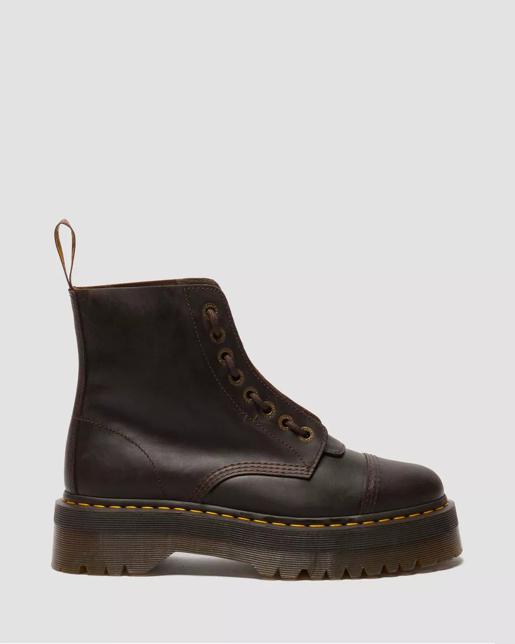 Worn-in look, box-fresh feeling. This version of the Sinclair boot is made from rugged brown Crazy Horse leather, which gives it the look of a boot already sun-bleached from summers of pavements and festival fields. The grooved sole is secured with a bitter choc welt and yellow stitching, and the top of the boot is tagged with a brown and yellow heel loop. You can wear it with or without its statement front zip for maximum versatility or a customized look.