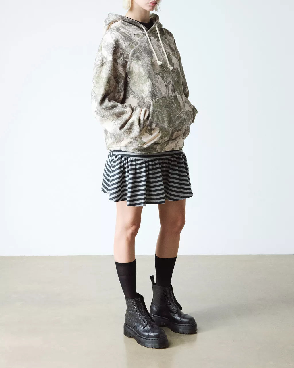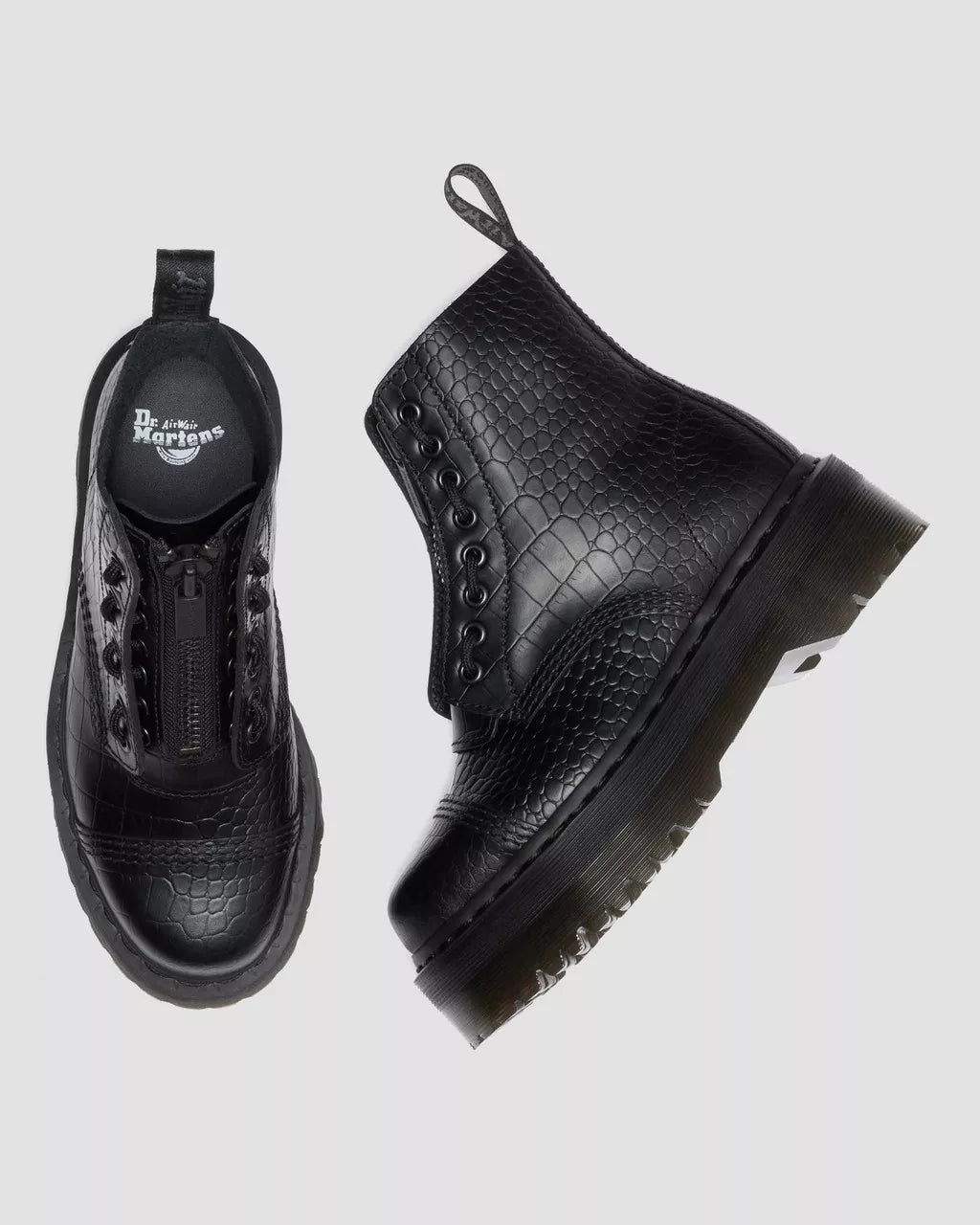 An elevation in croc. This is the fan favorite Sinclair 8-eye boot, remixed in Atlas Croc Emboss leather. With a distinctive satin sheen finish that stands apart from previous iterations, this new style retains all of the Sinclair boot’s signature features: the customizable lace/ zip vamp. The scripted heel loop. Black welt stitching. And a chunky black Quad platform sole for maximum impact.