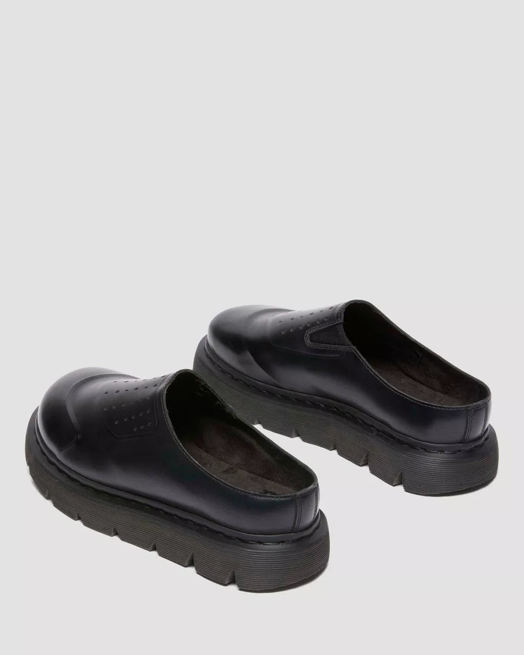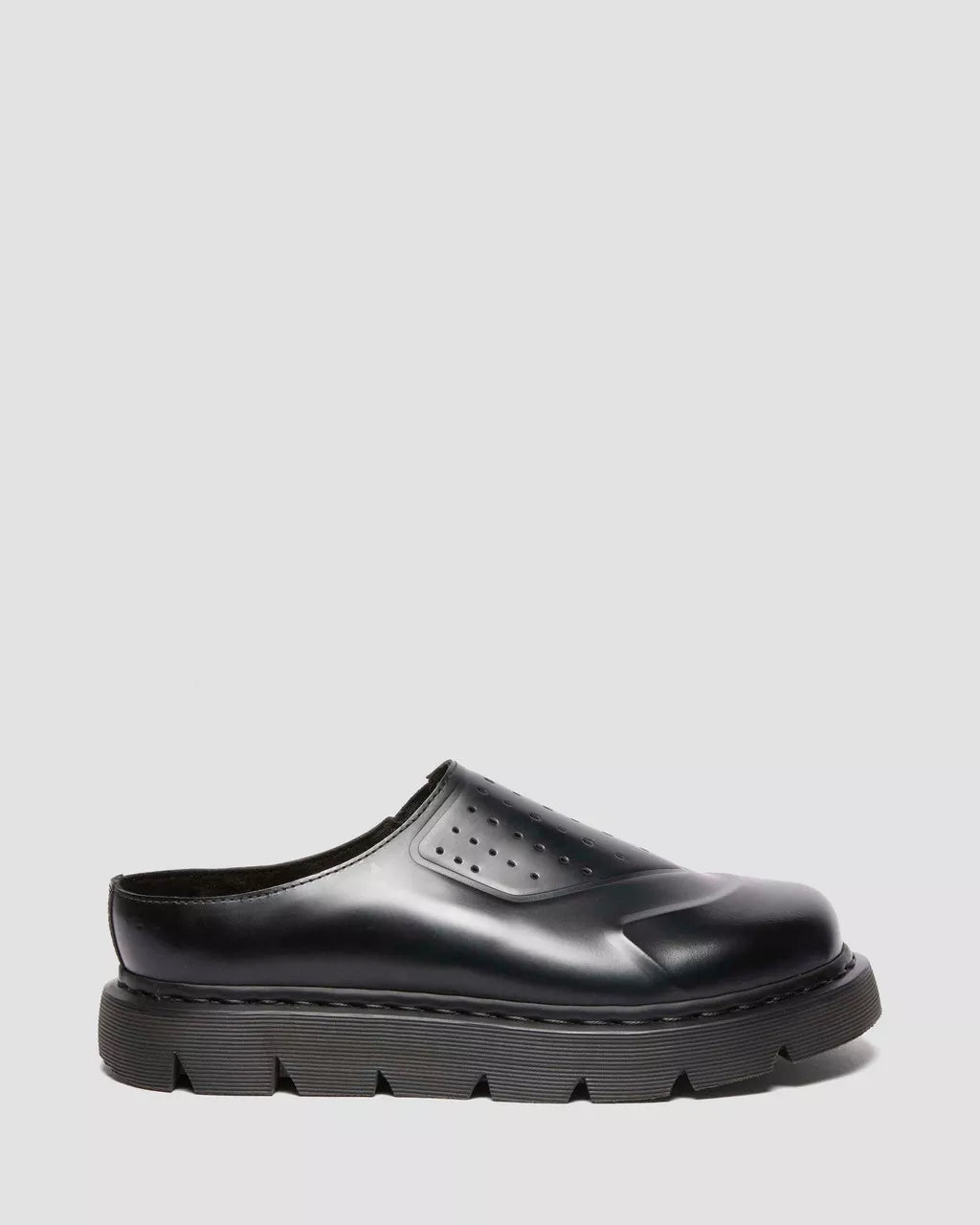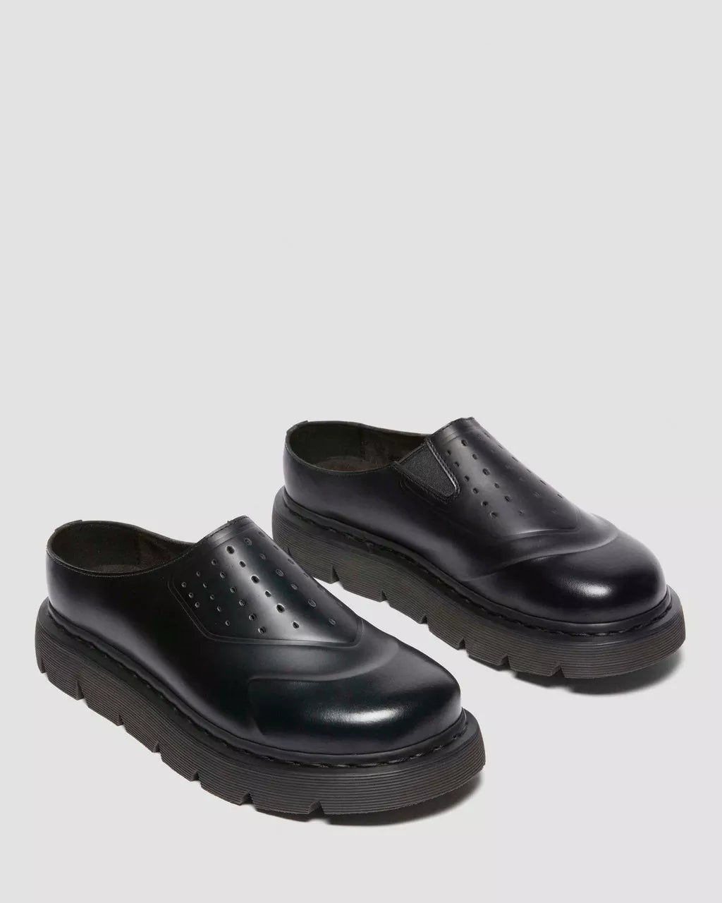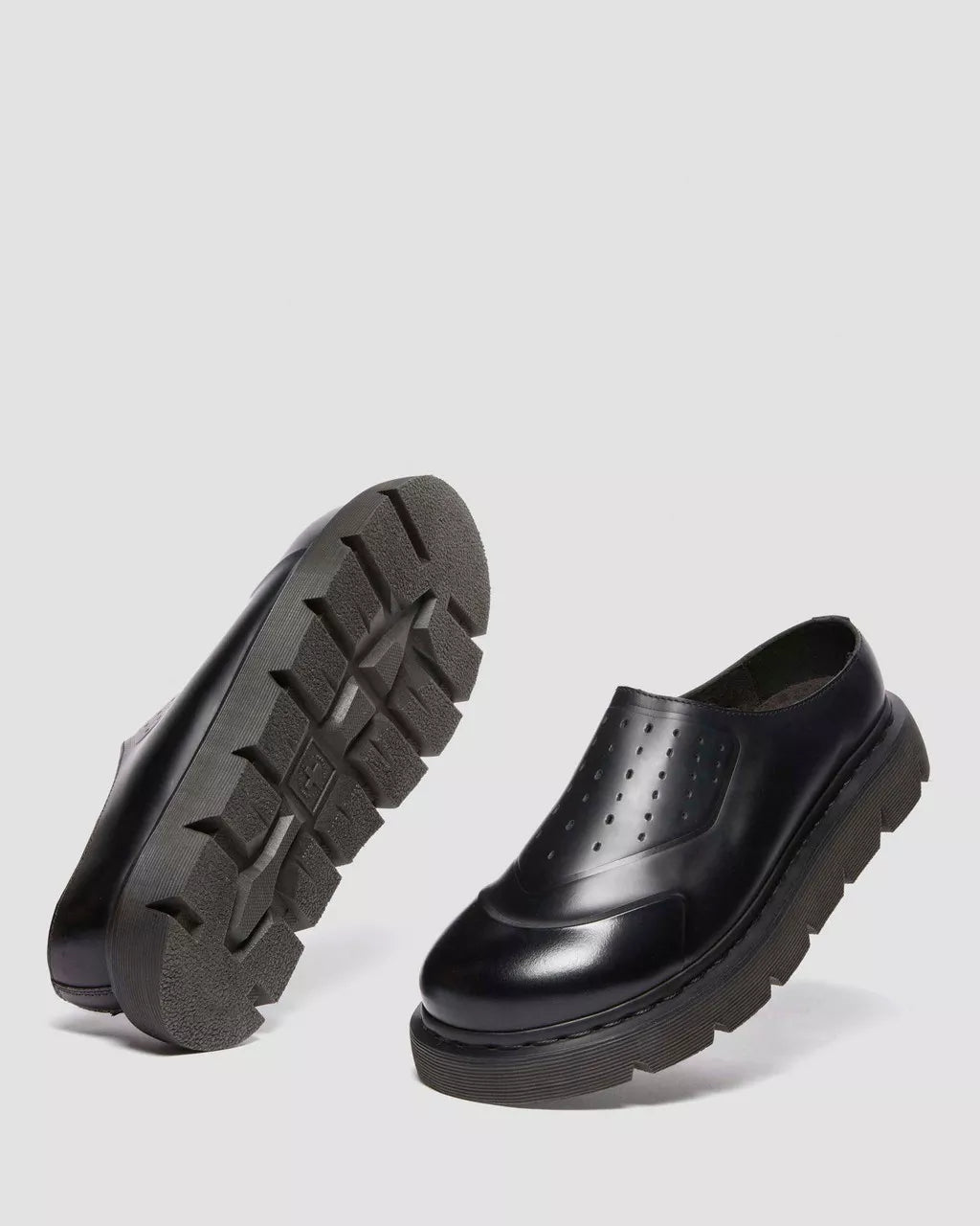Protection stripped back. A traditional mule reengineered with industrial aesthetics. Constructed from high-shine Polished Smooth leather. The structure is enhanced with a silicone toe cap and perforated for additional airflow. Each pair is equipped with an elastic gusset for a secure fit. Supplemented with a comfort-focused microfiber insole. Set on the new Shore 2.0 outsole fabricated from blown PVC to reduce weight without sacrificing durability. Fused to the upper with a black-on-black welt stitch.