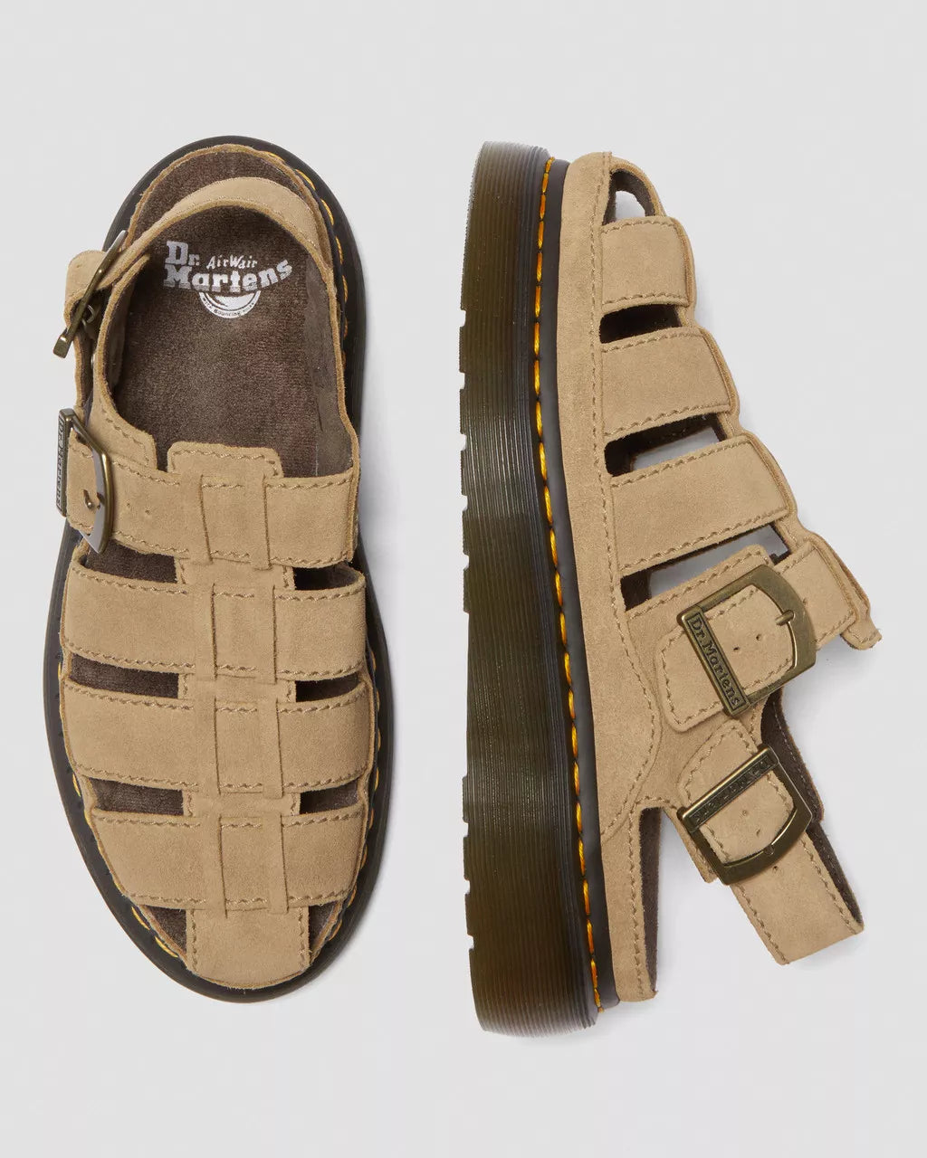 Dial up summer. Our new Fisherman sandal revives summer-infused nostalgia with the attitude, timelessness and versatility of our 90s fisherman. This new edition is stacked on a stacked Quad Shore sole to stand out as much as we always have. The sandals are detailed with branded buckles and yellow welt stitching to reinforce your DM’s DNA.Bronx Suede is heavyweight, firm handle suede with an oily finish.Our Goodyear-welted lines are heat-sealed and reinforced with our signature welt stitch