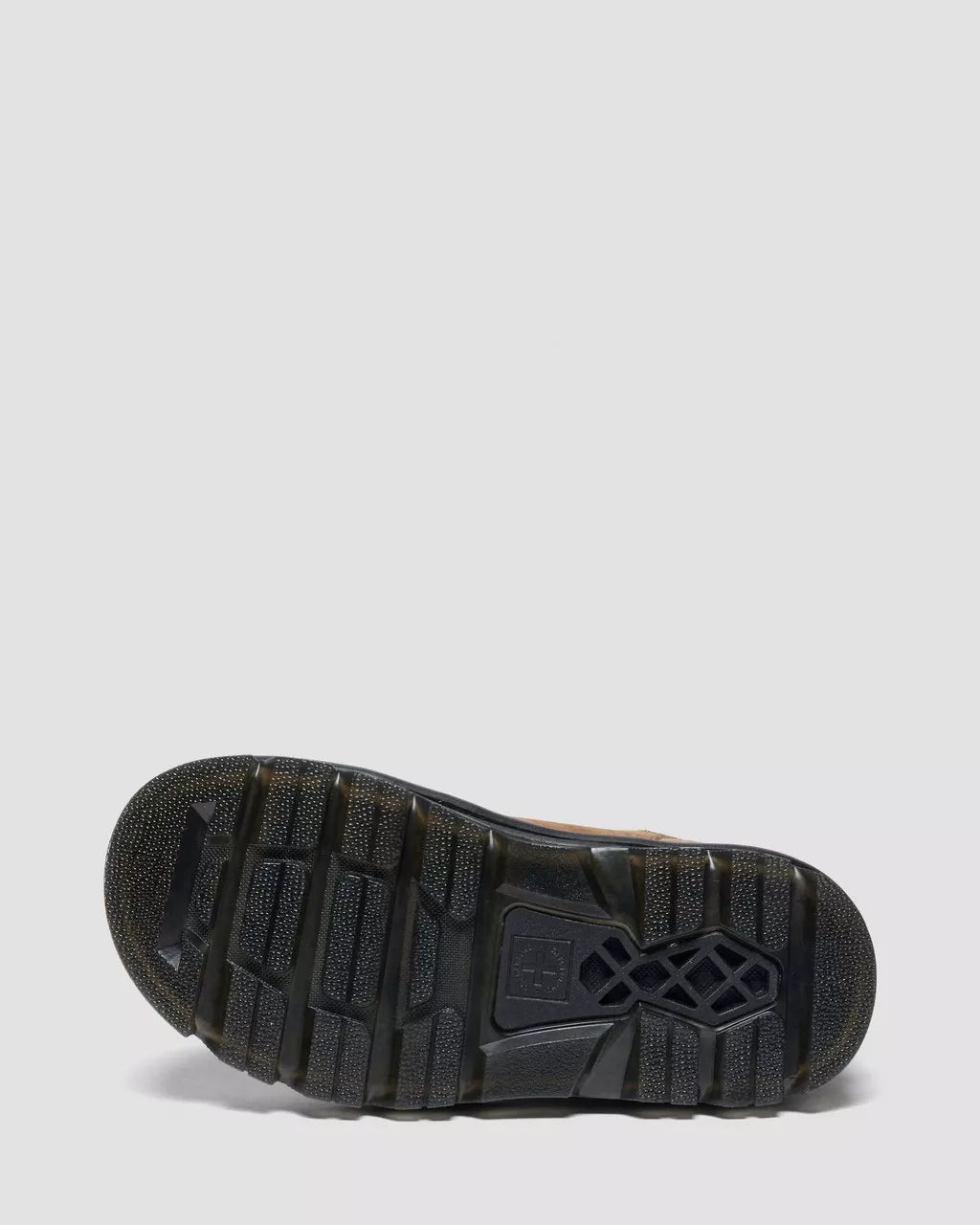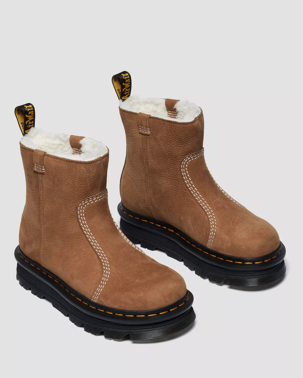 Easy comfort, easy go. Our new Zebzag Rigger boot has a silhouette inspired by industrial footwear — rebuilt for easy living and even easier styling. And this version is fitted with a WarmWair lining, so your comfort doesn’t have to compromise when the weather turns. Made with silky-yet-water-resistant Milled Nubuck with dual pull tabs on either side — so you can pull on and head out. The ergonomic Zebzag sole combines lightweight EVA and durable PVC to give your feet an easy ride without limiting your destination. And our SoftWair footbed adds extra cushioning. The sole boasts distinctive DM's signatures, with a bold tread pattern, exaggerated grooving, and our unmistakable yellow welt stitching.